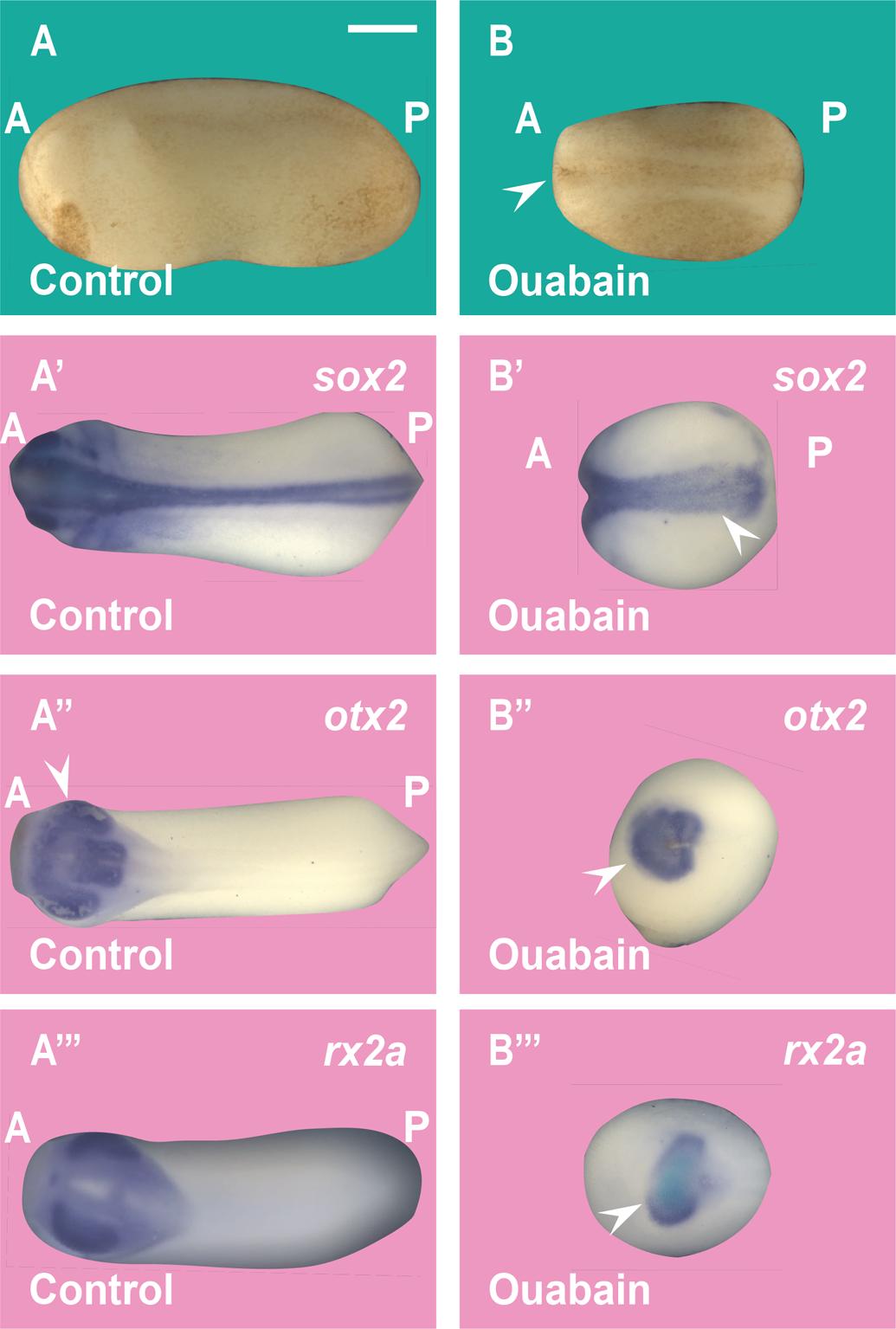 Fig. 4.Ouabain inhibits anterior CNS development in Xenopus embryos. (A-B) Incubation of Xenopus embryos at the 32-cell stage in 10 μM Ouabain for 7 min results in embryos with a ventralized (small head) phenotype. A, anterior; P, posterior. (A′-B′) Ouabain incubation reduced the pan-neural marker sox2 in Xenopus embryos. (A″-B″) Ouabain incubation reduces the forebrain and midbrain marker Otx2 in Xenopus embryos (arrowhead). (A‴-B‴) Ouabain incubation reduces the eye marker Rx2a in Xenopus embryos. The numbers of embryos analyzed were as follows: A: 130, 100%; A′: 138, 97%; five independent experiments; A′: 32, 100%; B′: 36; 97%; A″: 32, 100%; B″: 28, 92%; A‴: 30, 100%; B‴: 27, 93%. Scale bar: 500 μm. |