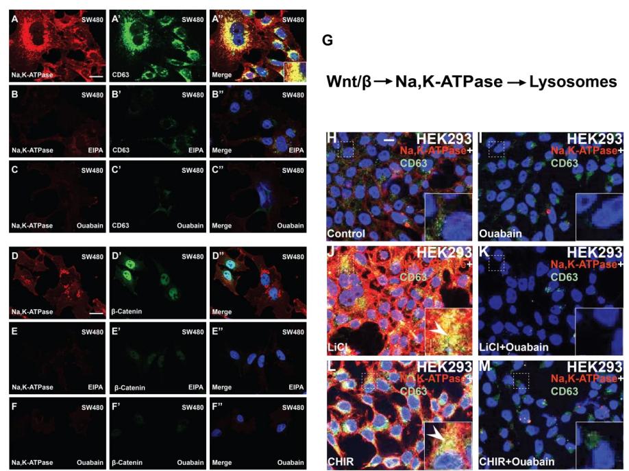 Fig. S1 The Na,K-ATPase is Accumulated in Lysosomes by Wnt Pathway Activation and Depends on Macropinocytosis; Related to Figure 2 (A-A’’) The human SW480 colon adenocarcinoma cell line, which constitutive Wnt, was stained with Na,K-ATPase and CD63 antibodies, which colocalized. (B-B’’) SW480 cells treated with the EIPA (40 µM) macropinocytosis inhibitor have reduced levels of Na,K-ATPase, and CD63. (C-C’’) The Na,K-ATPase inhibitor Ouabain (200 nM) reduces CD63 levels, presumably through the inhibition of macropinocytosis. (D-D’’) SW480 cells stained with Na,K-ATPase and -catenin antibodies. (E-E’’) The macropinocytosis inhibitor EIPA reduces Na,K-ATPase levels and blocks Wnt signaling. (F-F’’) Ouabain decreases Na,K-ATPase and β-catenin accumulation. (G) Diagram illustrating that activation of Wnt causes the endocytosis of the Na,K-ATPase in lysosomes. (H) Control HEK293 cells stained with CD63 and Na,K-ATPase antibodies. (I) Ouabain (1 M) overnight treatment reduced basal levels of Na,K-ATPase. (J) The activation of the Wnt pathway via GSK3 inhibition with LiCl (40 mM) strongly increased Na,K-ATPase and CD63 levels. (K) Ouabain treatment strongly reduced the levels of CD63 and Na,K-ATPase that were enhanced by LiCl. (L) A second GSK3 inhibitor CHIR99021 (8 nM) was used to validate the increased levels of CD63 and Na,K-ATPase caused by GSK3 inhibition (which is a potent inducer of macropinocytosis). (M) Ouabain blocked the stabilization of Na,K-ATPase (and CD63) induced by CHIR99021. Data from four independent experiments; Scale bars 10 μm. |