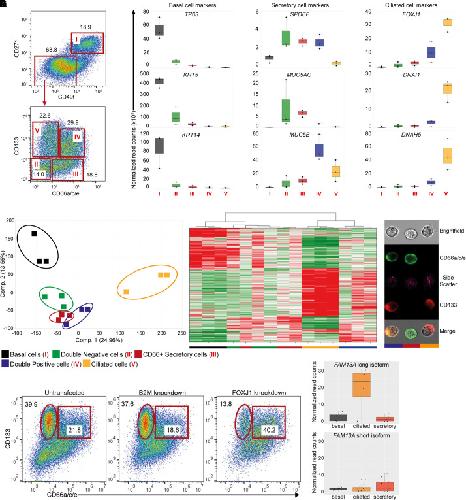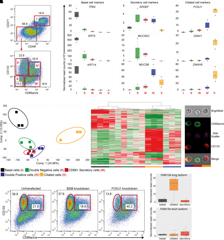 . Identification and characterization of epithelial cell subsets from cultures differentiated at the air–liquid interface (ALI). (A) Representative flow cytometry dot plots illustrating cell surface expression of CD271, CD49f, CD133, and CD66a/c/e on hBEC ALI cultures at Day 28. The five populations, indicated with red roman numerals, were isolated to homogeneity by fluorescence-activated cell sorting. (B–D) Lineage-specific gene expression analysis of sorted epithelial cell subsets by RNA sequencing. Box plots illustrate mean normalized read counts and SD. (B) Basal cell markers. (C) Secretory cell markers. (D) Ciliated cell markers. Distinct subpopulations are color coded in (B)–(G) and (I). (E) Principal-component analysis illustrating two components that best define transcriptional territories occupied by epithelial cell subpopulations. (F) Heatmap illustrating unsupervised hierarchical clustering of significantly expressed and regulated genes (FC ± 1.5, P < 0.05) in epithelial cell subsets, demonstrating lineage relationships. The Double Positive population closely aligns with the ciliated cell populations, suggesting a precursor–product relationship between these populations. (G) Representative ImageStream X MKII images of bronchial epithelial cells. CD133 is expressed on ciliated cells and double-positive progenitors. It is interesting that polarization of CD133 is already observed on double-positive progenitor cells. A population of CD66a/c/e single-positive cells is clearly visible. (H) Representative dot plots of CD133 and CD66a/c/e expression on unmanipulated, B2M, and FOXJ1 knockdown hBECs. Initial gating was performed as described in (A). (I) FAM13A isoform expression analysis of sorted epithelial cell subsets by RNA sequencing. Box plots illustrate mean normalized read counts and SD. Three donors were used for cell sorting and RNA sequencing in three separate experiments. Two donors in two separate experiments were used in gene-editing studies. FC = fold change.