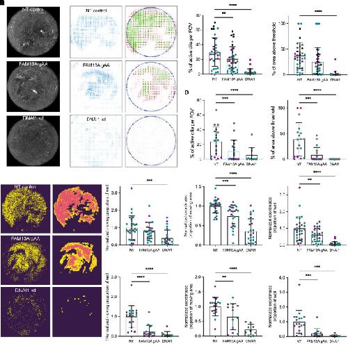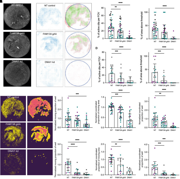 . FAM13A long-isoform knockdown reduces cilia coordination in differentiated hBEC mucociliary clearance assays. (A) Maximum projections of fluorescent movies of bead movement in 8% mucin on differentiated NT control, FAM13A gAA, or DNAI1 knockdown (kd) hBEC cultures. (B) Steps from quantification of hBEC bead assay with the “Cambridge” pipeline. Left: raw flow velocity vector field. Right: final flow velocity vector field: red indicates raw measured velocity vectors, blue dotted line indicates circular mask, black indicates moving cilia, and green indicates vectors with magnitude above threshold. (C) Comparison of the percentage of active cilia and percentage of culture above threshold movement in mucociliary transport assays with fluorescent beads in 8% mucin on differentiated NT, FAM13A gAA, or DNAI1 knockdown hBEC cultures using the Cambridge pipeline. Six independent assays, four hBEC donors (indicated with purple, teal, gray, and black), four to six cultures per genotype. Data indicate mean ± SD, two-way ANOVAs. Left graph: **P = 0.0011 and ****P < 0.0001. (D) Comparison of the percentage of active cilia and percentage of culture above threshold movement in 2.5% methylcellulose on differentiated NT, FAM13A gAA, or DNAI1 knockdown hBEC cultures using the Cambridge pipeline. Three independent experiments, three hBEC donors (indicated with purple, teal, and gray), four to six cultures per genotype. Data indicate mean ± SD, two-way ANOVAs. Left graph: ***P = 0.0006. Right graph: ***P = 0.0003 and ****P < 0.0001. (E) Steps from quantification of hBEC bead assay with the “Stevenage” pipeline. Left: pixels that change in intensity over the course of the experiment were used to form the moving mask. Right: moving and coordinated masks overlaid. (F) Comparison of moving and coordinated regions of bead movement in mucociliary transport assays with fluorescent beads in 8% mucin on differentiated NT, FAM13A gAA, or DNAI1 knockdown hBEC cultures using the Stevenage pipeline. Five independent experiments, three hBEC donors (indicated with purple, teal, and gray), four to six cultures per genotype. Data indicate mean ± SD, two-way ANOVAs. Left graph: ***P = 0.0003. Middle graph: ***P = 0.0002 and ****P < 0.0001. Right graph: **P = 0.0068 and ****P < 0.0001. (G) Comparison of moving and coordinated regions of bead movement in mucociliary transport assays with fluorescent beads in 2.5% methylcellulose on differentiated NT, FAM13A gAA, or DNAI1 knockdown hBEC cultures using the Stevenage pipeline. Three independent assays, three hBEC donors (indicated with purple, teal, and gray), four to six cultures per genotype. Data indicate mean ± SD, two-way ANOVAs. Left graph: ****P < 0.0001. Middle graph: **P = 0.0040 and ****P < 0.0001. Right graph: ***P = 0.0006 (bottom) and 0.0005 (top). Two-way ANOVA factors were defined as experiment and genotype. The P values quoted here correspond to the P values associated with the effect of variation between genotypes. FOV = field of view.