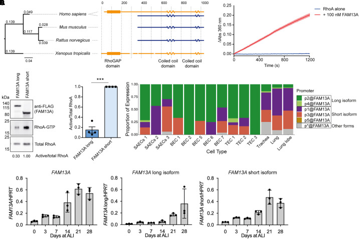 . FAM13A isoforms are differentially expressed across species and between human airway epithelial cell types. (A) Representation of the conservation of the two FAM13A isoforms across human, mouse, rat, and frog species. Distances are based on the conservation of the region shared between the long and short isoforms. Length of solid black lines demonstrates number of substitutions per site, bar of length 0.04 shown for scale. (B) GTP hydrolysis of purified RhoA alone or incubated with 100 nM purified FAM13A N-terminal domain. Δ Abs represents change in absorbance. (C) Pulldown of active RhoA from HEK 293T cell lysates with overexpressed FLAG-tagged FAM13A long isoform or FAM13A short isoform and quantification of the ratio of active RhoA-GTP to total RhoA, normalized to the levels when FAM13A short isoform is expressed (n = 4, paired t test, P = 0.0008). (D) Abundance of FAM13A isoform expression in lung tissue and airway epithelial cell types in the Functional Annotation of the Mammalian Genome 5 data set. (E) mRNA expression levels of FAM13A isoforms during primary human bronchial epithelial cell (hBEC) differentiation at indicated days of ALI culture. Values are normalized to HPRT1. Bars represent triplicate cultures and mean ± SD. BEC = bronchial epithelial cells; RhoGAP = Rho GTPase-activating protein; SAEC = small airway epithelial cells; TEC = tracheal epithelial cells.