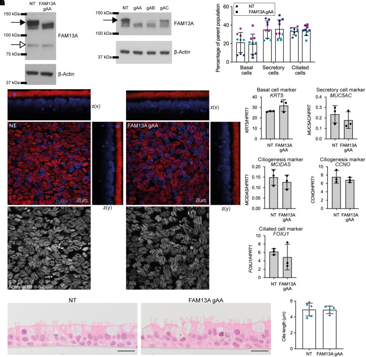 . FAM13A long-isoform knockdown does not affect hBEC differentiation. (A) FAM13A isoform expression in hBEC cultures edited with nontargeting control (NT) or “FAM13A gAA” CRISPR guide RNA. Long isoform is indicated with a closed arrow, and short isoform is indicated with an open arrow (expected molecular weights were 117 kD and 80 kD, respectively). (B) Expression of FAM13A long isoform (closed arrow) protein in hBEC cultures edited with NT or three CRISPR guide RNAs targeting the FAM13A long isoform. (C) Flow cytometry analysis of epithelial cell populations in NT and FAM13A gAA cultures. Three independent experiments between Day 25 and Day 31 of ALI culture (annotated in different colors), triplicate cultures per experiment. Data indicate mean ± SD. (D) Immunofluorescent staining of cilia (acetylated α-tubulin, red) in NT and FAM13A gAA differentiated hBEC cultures, Scale bars, 20 μm. (E) mRNA expression of epithelial cell marker genes in NT and FAM13A gAA differentiated hBECs. Values are normalized to HPRT1. Bars represent triplicate cultures from a single donor; results are representative of experiments from two donors, mean ± SD. (F) Hematoxylin and eosin staining of NT and FAM13A gAA differentiated hBEC cultures. Scale bars, 20 μm. (G) Quantification of cilia length from hematoxylin and eosin staining of NT and FAM13A gAA differentiated hBEC cultures. Two independent cultures of hBECs from different donors, three Transwells per genotype, 100 cilia lengths measured per Transwell. Data indicate mean ± SD; two-way ANOVA, not significant.