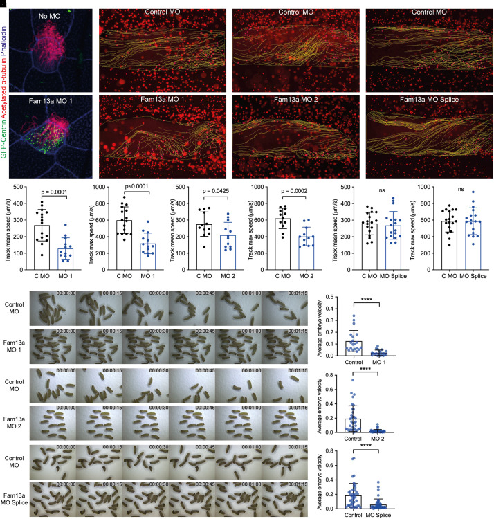 . Fam13a long-isoform knockdown in Xenopus laevis embryos affects epidermal cilia function. (A) Immunofluorescent images of X. laevis epidermis after coinjection of morpholino (MO) 1 and GFP-centrin (injection control). (B–D) Representative stills from Trackmate analysis of bead movement movies with control and (B) MO 1, (C) MO 2, or (D) MO Splice. (E–G) Quantification of Trackmate analysis with control (abbreviated as C) and (E) MO 1, (F) MO 2, or (G) MO Splice. Data indicate mean ± SD, unpaired t test. Tracks averaged across each embryo. (E) Control, n = 1,815 from 16 embryos; MO 1, n = 1,990 from 13 embryos; three independent experiments. (F) Control, n = 1,510 from 12 embryos; MO 2, n = 2,018 from 12 embryos; two independent experiments. (G) Control, n = 2,893 from 18 embryos; MO Splice, n = 2,604 from 18 embryos; three independent experiments. (H–J) Stills from brightfield movies of X. laevis embryo drift and quantification of embryo movement with control and (H) MO 1, (I) MO 2, or (J) MO Splice. Data indicate mean ± SD, unpaired t tests with Welch’s correction, P < 0.0001. (H) Twenty embryos, two independent experiments. (I) Control, n = 34 embryos; and MO 2, n = 43 embryos, three independent experiments. (J) Control, n = 34 embryos; MO Splice, n = 43 embryos; three independent experiments. ****P < 0.001. ns = not significant.