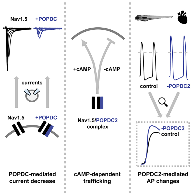 Popeye domain containing (POPDC) proteins are predominantly expressed in the heart and skeletal muscle, modulating the K2P potassium channel TREK-1 in a cAMP-dependent manner. POPDC1 and POPDC2 variants cause cardiac conduction disorders with or without muscular dystrophy. Searching for POPDC2-modulated ion channels using a functional co-expression screen in Xenopus oocytes, we found POPDC proteins to modulate the cardiac sodium channel Nav1.5. POPDC proteins downregulate Nav1.5 currents in a cAMP-dependent manner by reducing the surface expression of the channel. POPDC2 and Nav1.5 are both expressed in different regions of the murine heart and consistently POPDC2 co-immunoprecipitates with Nav1.5 from native cardiac tissue. Strikingly, the knock-down of popdc2 in embryonic zebrafish caused an increased upstroke velocity and overshoot of cardiac action potentials. The POPDC modulation of Nav1.5 provides a new mechanism to regulate cardiac sodium channel densities under sympathetic stimulation, which is likely to have a functional impact on cardiac physiology and inherited arrhythmias.