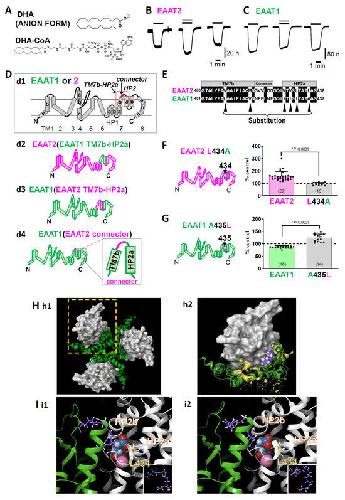 Figure 2. (A) The chemical structures of DHA and DHA-CoA. (B) Representative traces of L-glutamate (L-Glu, 50 μM for 2 min, black horizontal line)-induced current obtained from Xenopus oocytes overexpressing EAAT2 clamped at −50 mV in the absence or presence of DHA (100 μM for 2 min, grey horizontal line). When coapplied, DHA increased the L-Glu-induced EAAT2 current, and the effect disappeared after washout. (C) Representative traces of L-Glu-induced EAAT1 currents in the absence or presence of DHA. When the compounds were coapplied, DHA tended to decrease the EAAT1 current, and the effect disappeared after washout. (D) Topology of EAAT1, EAAT2 (d1). EAAT1/2 is organized into eight transmembrane (TM1-8) and two helical hairpins (HP1 and HP2), which are re-entrant loops. TM7b-HP2a sequence and connector sequence in the red square. d2-d4. EAAT1-EAAT2 hybrid chimeras: EAAT2 (EAAT1 TM7b-HP2a) (d2), EAAT1 (EAAT2 TM7b-HP2a) (d3), and EAAT1 (EAAT2 connector) (d4). (E) Amino acid alignment from TM7b to HP2a of EAAT2 and EAAT1. The common amino acids are shown on a black background. Single amino acid back-mutations were performed at the sites indicated by black arrowheads in the EAAT1 (EAAT2 TM7b-HP2a) chimaera. (F) Left, topology of EAAT2 L434A. Right, comparison of the effects of DHA on EAAT2 and EAAT2 L434A. Data are shown as rates of increase by DHA. (G) Left, topology of EAAT1 A435L. Right, comparison of the effects of DHA on EAAT1 and EAAT1 A435L. Data are shown as rates of increase by DHA. (H) Proposed binding conformation for DHA in the transport domain/scaffold domain interface of the EAAT2 homology model in the outward facing state (OFS). (h1). Extracellular view of the trimerized EAAT2 OFS homology model based on the EAAT1 crystal structure. The scaffold domain is shown as a green ribbon. The transport domain is shown as a grey surface. (h2). Magnified monomer in the hatched square in h1 in the presence of DHA. The lipid crevice calculated by SiteMap exists at the interface between the scaffold domain and the transport domain (yellow space). DHA is docked to the lipid crevice (carbon: purple spheres; hydrogen: white spheres). (I) Docking poses of DHA in the lipid pocket in the vicinity of HP2 according to the induced fit docking protocol. The scaffold domain and transport domain are shown in green and grey ribbons, respectively. The carbons in DHA and EAAT2 L434 are represented by purple and yellow sticks, respectively. The atoms in L-Glu are shown as follows: carbon, blue sphere; hydrogen, white sphere; oxygen, red sphere; nitrogen, hidden. Na+ is shown as a pink sphere. Two types of DHA conformations could be visualized according to the position of the carboxylic group, i.e., one with a carboxyl group on the upper side (i1) and the other with a carboxyl group on the lower side (i2). Both of them have similar U-shaped conformations. The inset shows the DHA conformations in each case. The three-dimensional position of DHA is in close proximity to the L-Glu binding site and Na+ binding site. Error bars represent the mean ±SD. The numbers written within parentheses in the respective figures represent the number of independent experiments. Statistical differences between groups were determined by two-tailed paired Student’s t test. p values are indicated in each figure panel [58]. |