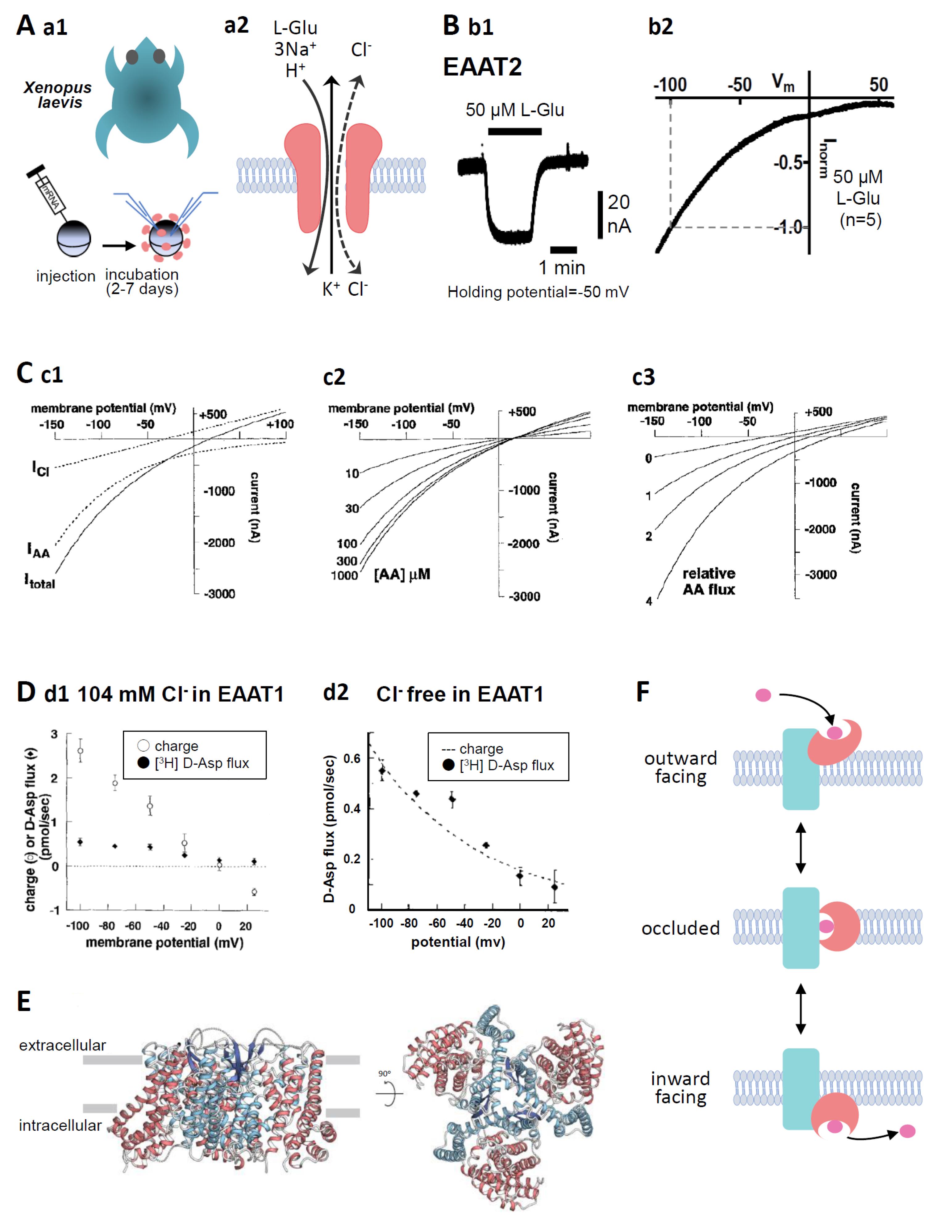 Figure 1. (A) (a1). Oocytes were collected from anaesthetized Xenopus laevis. The isolated oocytes were then treated with collagenase (2 mg mL−1, type 1), and capped mRNA was injected into either defolliculated stage V or VI oocytes. The oocytes were incubated for 2–7 d at 18 °C in ND96 solution containing 96 mM NaCl, 2 mM KCl, 1.8 mM CaCl2, 1 mM MgCl2, and 5 mM HEPES (pH 7.5) supplemented with 0.01% gentamycin. TEVC recordings from the oocytes were performed at room temperature (25 °C) using glass microelectrodes filled with 3 M KCl (resistance = 1–4 MΩ) and an Ag/AgCl pellet electrode. (a2). Substrate- and the coupling ion-transports by EAATs. Substrate, such as L-Glu, L-Asp, or D-Asp, transport through EAATs is coupled to the co-transport of 3 Na+ and 1 H+ followed by the counter transport of 1 K+. In addition, the binding of substrates and Na+ to EAATs activates uncoupled Cl− anion currents. (B) (b1). A representative trace of L-Glu (50 μM for 2 min, black bar)-induced current obtained from Xenopus oocytes overexpressing EAAT2 clamped at −50 mV. (b2). IV relationship for L-Glu (50 μM)-induced EAAT2 current. To examine the IV relationship, the L-Glu-induced current was calculated through the subtraction of the steady-state current from the L-Glu-induced current. The curves were obtained with a holding potential of −60 mV applying an 8000 ms ramp pulse from −110 to +60 mV. Data are shown as the values normalized to that obtained with 50 μM L-Glu at −100 mV. Means, n = 5. (C) (c1). Model curves of transport-induced currents. The total L-Glu-induced EAAT currents (solid line: Itotal), electrophysiologically recorded using TEVC methods from EAAT-expressing Xenopus oocytes, represent the sum of the coupled L-Glu transport currents (dotted line: IAA) and the uncoupled Cl− anion currents (dotted line: ICl). (c2). The predicted reversal potential of the net current (Itotal) is independent of substrate concentration when the concentration dependence of IAA and ICl is the same. However, the amplitude of Itotal is dependent on the substrate concentration. (c3). The absolute reversal potential of Itotal is dependent on IAA relative to ICl [14] (copyright permission has been obtained). (D) (d1). D-Asp uptake and charge translocation were simultaneously measured during a 100 s application of 100 μM [3H] D-Asp to voltage-clamped oocytes expressing EAAT1 under 104 mM Cl− conditions. (d2). Voltage dependence of RI-labelled D-Asp flux and superimposed exponential (e-fold/75 mV) derived from fit of transport current under nominal Cl−-free conditions [14] (copyright permission has been obtained). (E) Overall structure of human EAAT2 as viewed from the membrane plane (left) and the intracellular side (right). The trimerization domain is blue and the transport domain is red. The protomer of EAAT2 is divided into two distinct functional components: one is a rigid scaffold domain that mediates interprotomer interactions and is located in the center of the trimer, and the other is a transport domain containing the substrate-binding site [15]. (F) Schematic representation of the transport cycle of EAATs (elevator motion). The transport domain (red) moves across the membrane relative to the trimerization domain (blue). The transported L-Glu is pink. When L-Glu binds to the transport domain of the EAAT in outward facing state (top), the conformation changes to occluded state (middle) first, then changes to inward facing state (bottom), thereby releasing L-Glu into the cell. |