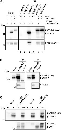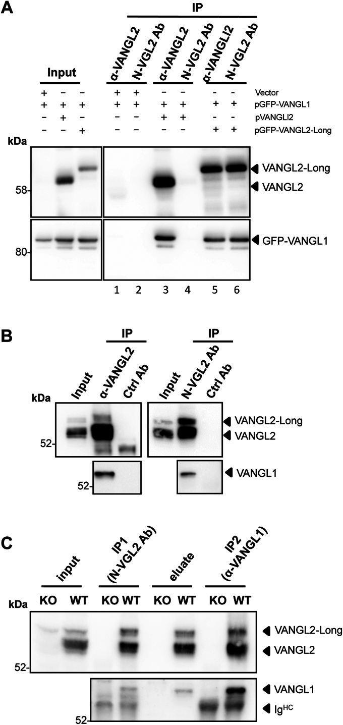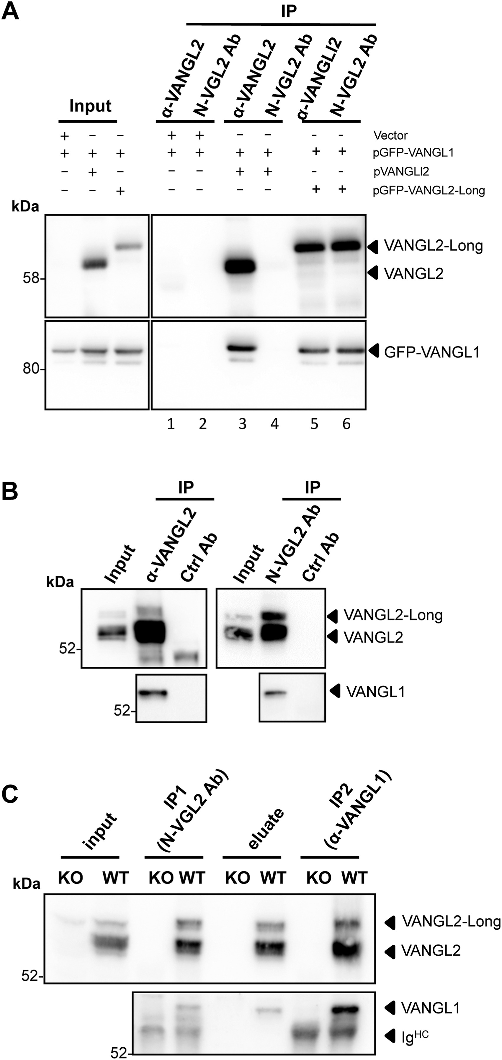 Figure 2. VANGL2 and VANGL2-Long form a tripartite complex with Vangl1 in vivo. A, immunoprecipitation of lysates from HEK 293T cells transfected with GFP-VANGL1 and a control plasmid or GFP-VANGL1 in combination with pVANGL2 or pVANGL2-Long, using mAb 36E3 or N-VGL2 pAbs, as indicated. The presence of GFP-VANGL1 and VANGL2 in the immunoprecipitated samples was determined by Western blotting using, respectively, a GFP-specific antibody (bottom panels) and mAb 36E3 (top panels). Arrows point to the VANGL2 and VANGL2-Long signals detected by mAb 36E3. B, SKBR7 cell extracts were immunoprecipitated with either mAb 36E3 (left panels) or N-VGL2 pAb (right panels), followed by a Western blot analysis of VANGL1 (bottom panels) and VANGL2 isoforms (top panels) using, respectively, mAb 19D5 and mAb 36E3 on two different membranes. Isotopic rat and rabbit antibodies were used as negative controls for each IP experiment (Ctrl Ab). C, lysates from WT and Crispr-Cas9 KO-VANGL2 (KO) HEK 293T cells were first immunoprecipitated with N-VGL2 pAb (IP1, N-VGL2 Ab). Bound proteins were subsequently eluted with the relevant immunogenic peptide (eluate) before being subjected to a second round of IP with VANGL1-specific mAb 19D5 (IP2, α-VANGL1). The different fractions were examined by immunoblotting for their VANGL1 (lower panel) and VANGL2 (upper panel) contents using, respectively, mAb 19D5 and mAb 36E3. Arrows in the upper panel indicate the two endogenous VANGL2 and VANGL2-Long isoforms, while those in the lower panel point to Vangl1 and immunoglobulin heavy chains (IgHC). pAb, polyclonal antibody.