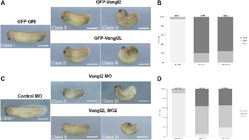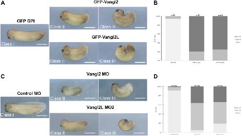Figure 4. Vangl2-Long overexpression and knockdown cause strong morphogenetic defects in Xenopus embryos. A, Xenopus embryos were injected with RNA coding for GFP-GPI as control in dorsal blastomeres at 4-cell stage and grown until stage stages 28 to 30. Overexpression of GFP-Vangl2 and GFP-Vangl2-Long caused body axis shortening (class II), or severe bending and defective neural tube closure (class III). In all panels, the scale bars represent 1 mm. B, histogram showing the class distribution of embryos injected as indicated. The bars represent the proportions of embryos in each class calculated for five independent experiments. The total number of embryos analyzed for each condition is given above each bar. C, 4-cell embryos were injected with control MO or MOs directed against Vangl2 (Vangl2 MO) and Vangl2-Long (Vangl2-Long MO2) in the marginal zone and grown until stage 31. In all panels, the scale bars represent 1 mm. D, histogram showing the class distribution of embryos injected as indicated. The bars represent the proportions of embryos in each class calculated for seven independent experiments. The total number of embryos analyzed for each condition is given above each bar. For both overexpression and knockdown assays, the statistical significance of the observed phenotypes was confirmed by a Pearson’s Chi-squared test between class II or class III versus class I, with a p-value<2.2e16. MO, morpholino oligonucleotide.