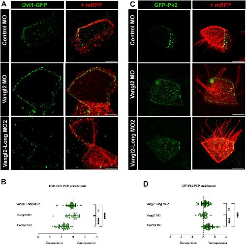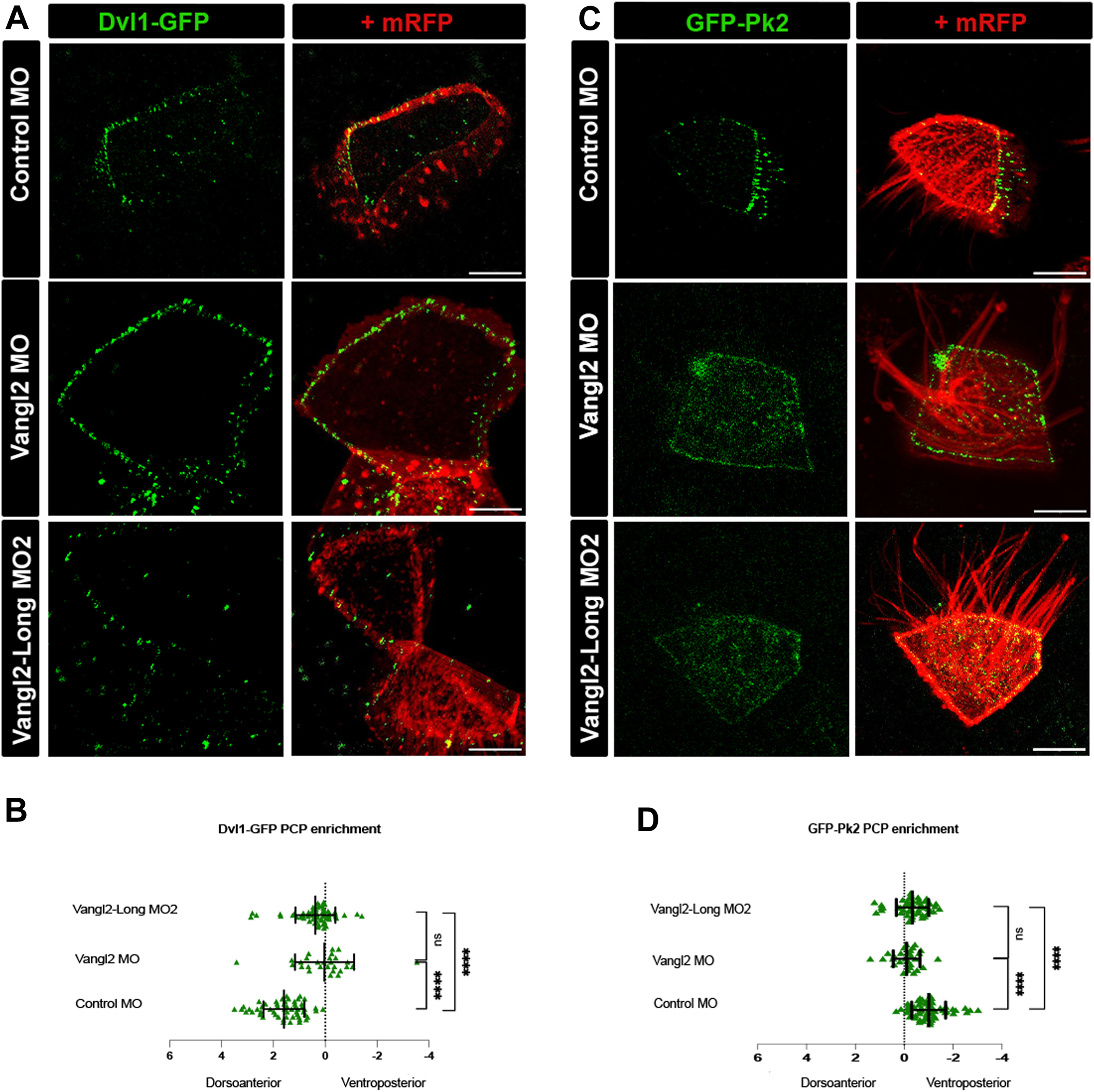 Figure 5. Vangl2 and Vangl2-Long knockdown disrupts core PCP protein asymmetric distribution. A, synthetic mRNAs encoding Dvl1-GFP and mRFP were injected at the 16-cell stage in one ventral animal blastomere, with control, Vangl2 or Vangl2-Long morpholinos. Fluorescent protein localization in epidermal cells was recorded in live embryos at stage 31. In all panels, the scale bars represent 10 μm. B, graph displaying the ratio of Dvl1-GFP signal intensity between dorsoanterior and ventroposterior domains of the cell membrane. Note that the dorsoanterior enrichment of Dvl1-GFP in control morphant cells (n = 59) is reduced in Vangl2 (n = 28) and Vangl2-Long (n = 65) morphant cells. C, synthetic mRNAs encoding GFP-Pk2 and mRFP were injected at the 16-cell stage in one ventral animal blastomere, with control, Vangl2 or Vangl2-Long morpholinos. Fluorescent protein localization in epidermal cells was recorded in live embryos at stage 31. In all panels, the scale bars represent 10 μm. D, graph displaying the ratio of GFP-Pk2 signal intensity between dorsoanterior and ventroposterior domains of the cell membrane. Note that the ventroposterior enrichment of GFP-Pk2 in control morphant cells (n = 23) is reduced in Vangl2 (n = 28) and Vangl2-Long (n = 48) morphant cells. Statistical analyses were done using GraphPad Prism software, with Student’s t tests to evaluate significance. PCP, planar cell polarity.