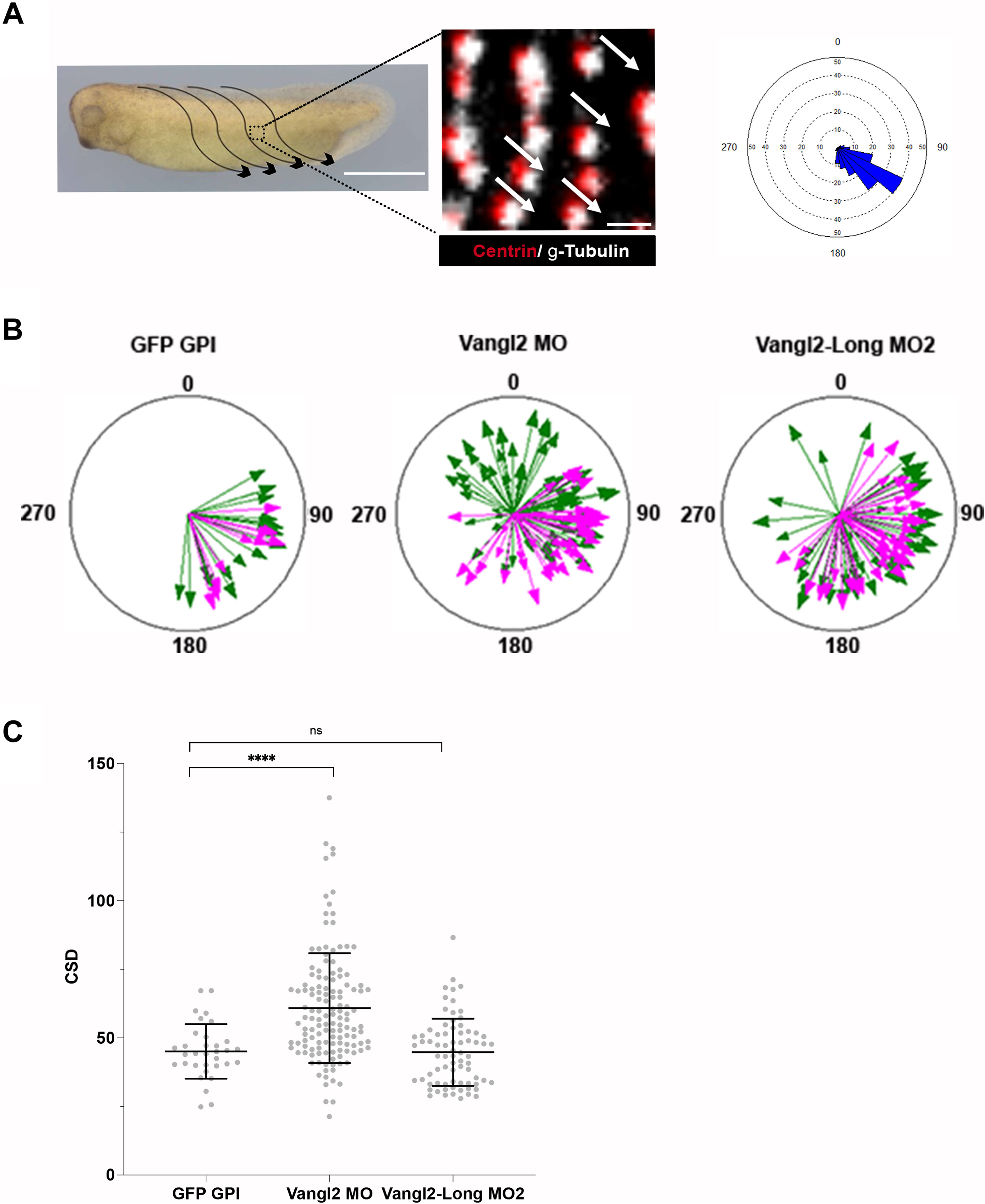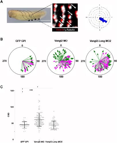 Figure 6. Centriole polarization is impaired by Vangl2 and Vangl2-Long knockdown. A, rational of the experiment. The flow generated by the coordinated beating of myriads of cilia in epidermal MCCs is represented by arrows along the flanks of a stage 31 Xenopus embryo (the scale bars represent 1 mm). Centriole/cilium rotational polarity is evaluated through double IF staining of the basal body (BB, Centrin) and the basal foot (γ-Tubulin) (the scale bar represents 1 μm). For each MCC, a rose histogram is generated by the Oriana software to plot the angles of orientation of unambiguously doubly stained BBs. The coordinates of the rose plot are aligned on those of the embryo. B, rose plots displaying mean BB orientation in control, Vangl2, and Vangl2-Long morphant MCCs. Each arrow represents one MCC. The length of the arrow is proportional to the degree of alignment of BBs with the mean vector. The two colors represent MCCs from two independent experiments. Note that Vangl2 and Vangl2-Long knockdown cause the dispersion of angles of orientation of individual MCCs. C, graph displaying the circular SD (CSD) of the angles of orientation of BBs, within MCCs analyzed in B. A low CSD indicates that BBs are well aligned along the mean vector in a given MCC, whereas a high CSD indicates a poor degree of alignment. Note that CSD values were higher than control in Vangl2 but not in Vangl2-Long morphant MCCs, indicating poor BB alignment in the former case. Statistical analyses were carried out with GraphPad Prism software with a Student’s t test to evaluate significance. IF, immunofluorescence; MCC, multiciliated cell.