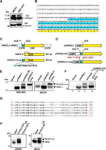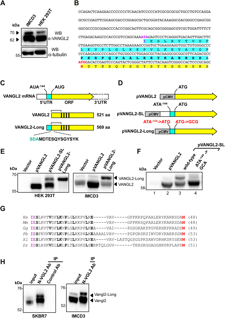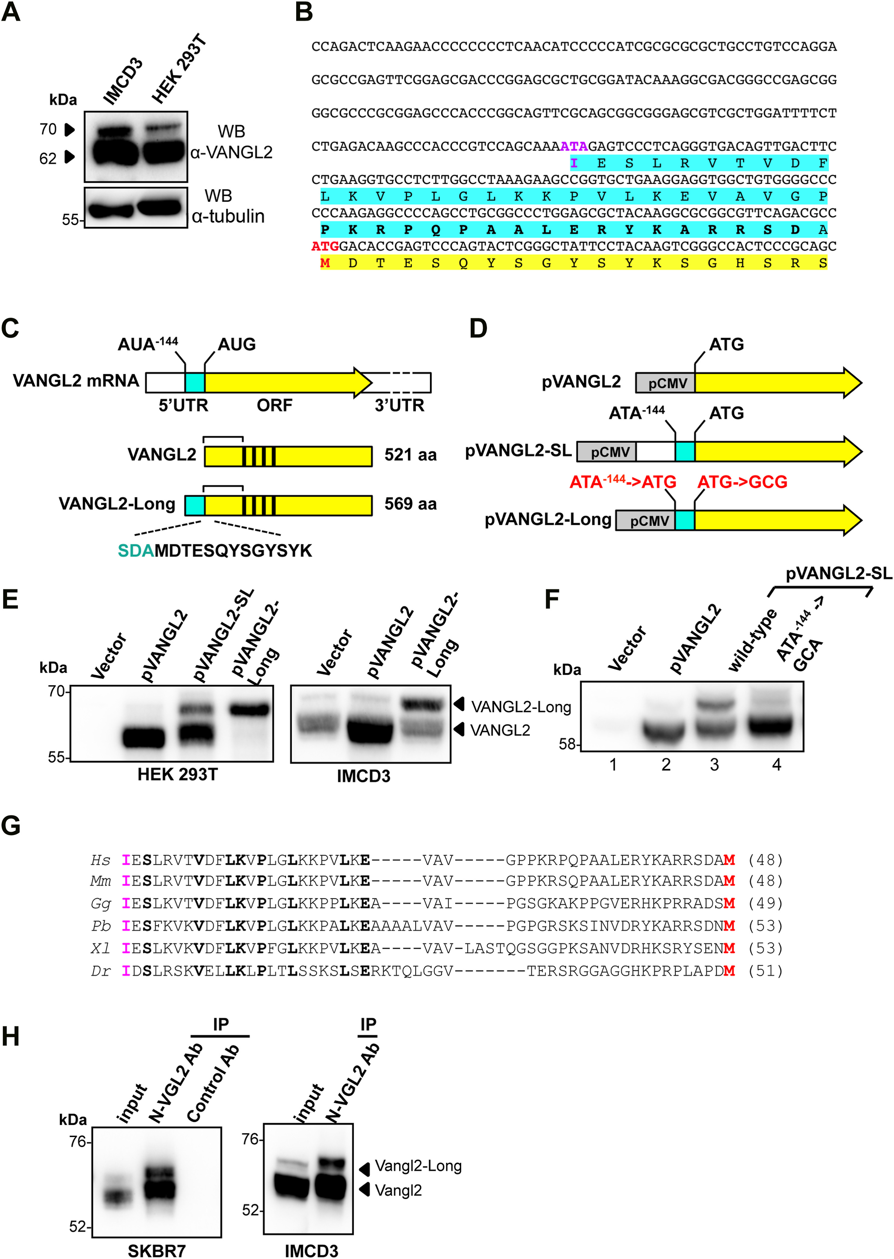 Figure 1. Identification of VANGL2-Long, a highly conserved N terminally extended VANGL2 isoform, in human and mouse cells. A, Western blot analysis of murine epithelial (IMCD3) and human embryonic kidney (HEK 293T) cell extracts using VANGL2-specific mAb 36E3 (top panel). Arrows point to the major 62 Kd VANGL2 protein and to a less intense and slower migrating band of 70 Kd both recognized by mAb 36E3. Immunoblot with an anti-alpha tubulin (bottom panel) was used as a loading control. B, DNA sequence of the 5′ region of human VANGL2 cDNA encompassing 342 bp of the 5′-UTR region immediately upstream to the conventional ATG start site (highlighted in red) and the first 57 bp of ATG-initiated VANGL2 ORF. A potential ATA alternative initiation site in position −144 (ATA-144) relative to the canonical VANGL2 ATG1 start site is highlighted in magenta. Amino acid sequences of VANGL2 and the N-terminal extension of VANGL2-Long are highlighted in yellow and cyan, respectively. The sequence of the peptide used to generate the N-VGL2 pAb rabbit antibodies is indicated in bold letters. C, diagram representations of the human VANGL2 mRNA (top) with its canonical (AUG) and near-cognate (ATA-144) initiation sites and the two VANGL2 (middle) and VANGL2-Long (bottom) encoded isoforms. Met-initiated VANGL2 and the ATA-initiated N-terminal extension are drawn in yellow and cyan, respectively. Black rectangles represent the four transmembrane domains present in both isoforms and numbers on the right give their respective length. The sequence of a peptide identified by mass spectrometry and encompassing the N terminus of VANGL2 (black) preceded by three residues of the 5′-UTR region (cyan) is shown below the VANGL2-Long diagram. Brackets above the two schematized isoforms indicate a common region recognized by mAb 36E3. D, schemes of pVANGL2 (top), pVANGL2-SL (middle), and pVANGL2-Long (bottom) vectors. All VANGL2 constructs are under the control of CMV promoter (gray box) and VANGL2 isoform representation uses the same color code as in (C). Note that, as indicated in red in pVangl2-Long, ATA-144 and the canonical ATG codon have been mutated to, respectively, ATG and GCG in order to enhance VANGL2-Long biosynthesis while abrogating VANGL2 expression by this construct. E, HEK 293T (left panel) and IMCD3 (right panel) cells were probed by immunoblotting with anti-VANGL2 mAb 36E3 upon transfection with the indicated plasmids. Note that the absence of endogenous VANGL2 signals in HEK 293T cells transfected with an empty plasmid (vector) is due to the short exposure time used to detect the overexpressed VANGL2 isoforms. Arrows point to VANGL2 and VANGL2-Long isoforms that are overexpressed by the relevant pVANGL2 and pVANGL2-Long constructs. Note that pVANGL2 SL promotes the synthesis of both VANGL2 and VANGL2-Long simultaneously (left panel). F, VANGL2-L expression requires a near-cognate AUA alternative initiation site in position −144. HEK293T cells transfected with either an empty plasmid (vector), p VANGL2, or pVANGL2-SL plasmids in which the predicted alternative AUA-144 start codon was either left intact (AUA-144) or mutated to GCA (GCA-144) were processed for Western blot analysis with mAb36E3 to detect all VANGL2 isoforms. G, amino acid sequence alignment of predicted N-terminal extensions from six vertebrate species, including human (Hs), mouse (Ms), chicken (Gg), python (Pb), African clawed frog (Xl), and zebrafish (Dr). Strictly conserved residues are in bold letters. AUA-encoded isoleucine residues that initiate the translation of all the extensions shown here are highlighted in magenta, whereas the AUG-encoded methionine residue of Vangl2 is in red. H, proteins extracted from SKBR7 (left panel) and IMCD3 (right panel) cells were immunoprecipitated with the VANGL2-Long isoform-specific N-Vgl2 pAbs and immunopurified proteins were immunoblotted with mAb 36E3. Control Ab is an isotypic control rabbit antibody. pAb, polyclonal antibody.
