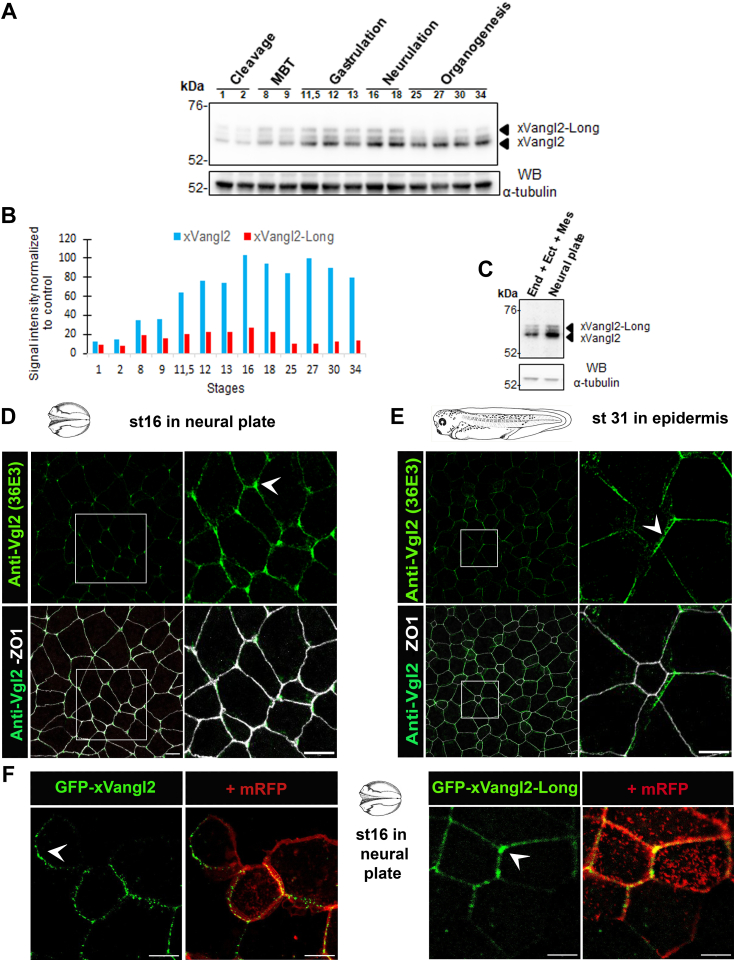 Figure 3. xVangl2-Long expression during Xenopus embryogenesis. A, whole Xenopus embryos collected at the indicated stages of development were used for protein extraction and Western blot analysis with mAb 36E3 (upper panel). Anti-tubulin immunoblotting was used to control protein loading (lower panel). The bands corresponding to xVangl2 and xVangl2-Long are indicated by black arrowheads. B, graphical representation of xVangl2 and xVangl2-Long normalized levels corresponding to the blot shown in (A). C, embryos at stage 14 were dissected to isolate the neural plate from the rest of the embryo, which comprised endodermal, ectodermal, and mesodermal tissues (End + Ect + Mes). Proteins were extracted and probed by Western blotting with mAb 36E3 (upper panel) and anti-tubulin (lower panel). D and E, spatial distribution of Vangl2 proteins revealed by immunofluorescence (IF) with mAb 36E3 in neural plate cells at stage 16 (D) and in epidermis at stage 31 (E). ZO1 IF was used to delineate cell junctions. White arrowheads point to polarized Vangl2 enrichment in the plasma membrane, which is anterior in neural plate cells and posterior in epidermal cells. F, GFP-xVangl2 and GFP-xVangl2-Long synthetic mRNAs were injected in dorsal blastomeres at 4-cell stage to reveal the spatial distribution of either Vangl2 isoform in neural plate cells of live stage 16 embryos. mRFP mRNA coinjection was used to delineate cell contours. White arrowheads point to anterior enrichment of Vangl2 and Vangl2-Long. In all panels, the scale bars represent 10 μm. MBT, midblastula transition.