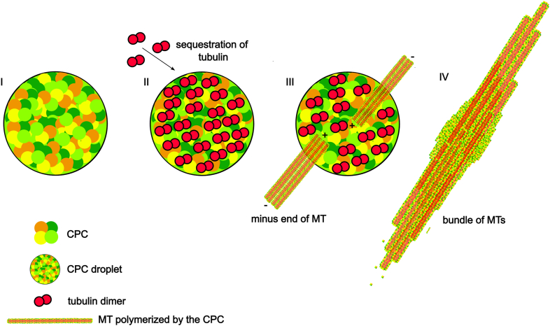 The mitotic spindle contains many bundles of microtubules (MTs) including midzones and kinetochore fibers, but little is known about how bundled structures are formed. Here, we show that the chromosomal passenger complex (CPC) purified from Escherichia coli undergoes liquid-liquid demixing in vitro. An emergent property of the resultant condensates is to generate parallel MT bundles when incubated with free tubulin and GTP in vitro. We demonstrate that MT bundles emerge from CPC droplets with protruding minus ends that then grow into long and tapered MT structures. During this growth, we found that the CPC in these condensates apparently reorganize to coat and bundle the resulting MT structures. CPC mutants attenuated for liquid-liquid demixing or MT binding prevented the generation of parallel MT bundles in vitro and reduced the number of MTs present at spindle midzones in HeLa cells. Our data demonstrate that an in vitro biochemical activity to produce MT bundles emerges after the concentration of the CPC and provides models for how cells generate parallel-bundled MT structures that are important for the assembly of the mitotic spindle. Moreover, these data suggest that cells contain MT-organizing centers that generate MT bundles that emerge with the opposite polarity from centrosomes.