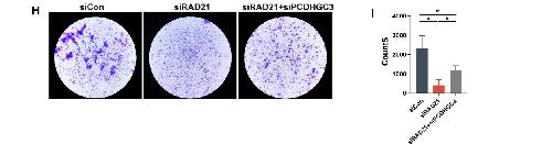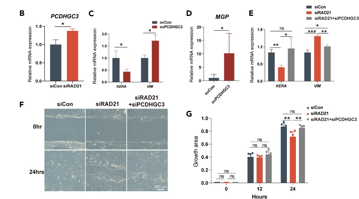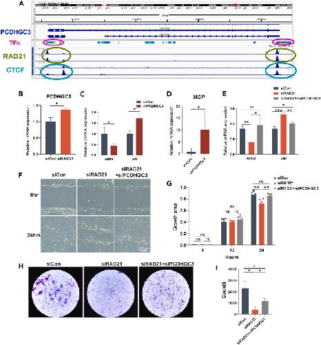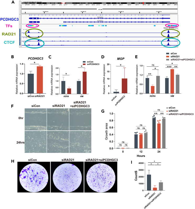 Figure 3. RAD21 induced upregulation of PCDHGC3 (A) Peaks of RAD21 (green circles), CTCF (blue circles), and TFs (red circles) are observed in both upstream and downstream of the PCDHGC3 gene. (B) qPCR analysis revealed upregulated PCDHGC3 expression in siRAD21-treated NCCs. PCDHGC3 exhibited 1.4-fold higher in the siRAD21 group than in the siCon group. n = 3. (C) At the end of differentiation, KERA exhibited 0.4-fold lower and VIM exhibited 1.7-fold higher in the ovPCDHGC3 group compared to the ovCon group. n = 3. (D) The scleral marker MGP exhibited 10.2-fold higher in the ovPCDHGC3 group compared to the ovCon group according to RNA sequencing data. n = 3. (E) Knock down of PCDHGC3 in RAD21-deficient NCCs served as a rescue strategy, and restored gene expression in KERA and VIM. n = 3. (F) Time-lapse images at time 0 and 24 h post-scratching. Scale bar = 200 μm. (G) Quantitative analysis of (F). At 24 h, the wound healing area of the rescue group was 1.2-fold higher than that of the siRAD21 group, resembling that of the siCon group. n = 3. (H) The transwell assay detects cell migration. (I) Quantitative analysis of (H). The number of migratory cells in the rescue group was 2.9-fold higher than in the siRAD21 group. Data are presented as mean ± standard deviation. n = 3. ∗p < 0.05, ∗∗p < 0.01, ∗∗∗p < 0.001, ns, no significance. |