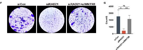 Figure 5. Knock down of WNT9B rescues defects in RAD21(A) WNT9B exhibited 2.4-fold higher in the siRAD21 group compared to the siCon group and 2.6-fold higher in the ovPCDHGC3 group compared to the ovCon group. n = 3.(B) qPCR analysis of the efficiency of overexpression of WNT9B in NCCs. n = 3. At the end of differentiation, VIM and MGP exhibited 1.7-fold and 2.1-fold higher in the ovWNT9B group compared to the ovCon group. n = 3.(C) Knock down of WNT9B in RAD21-deficient NCCs served as a rescue strategy, and restored gene expression in KERA, VIM, LUM, and MGP. n = 3.(D) Time-lapse images at time 0, 12, and 24 h post-scratching. Scale bar = 200 μm.(E) Quantitative analysis of (D). At 12 h and 24 h, the wound healing area of the rescue group was 1.3-fold higher and 1.2-fold higher compared to the siRAD21 group, resembling that of the siCon group. n = 3.(F) The transwell assay detects cell migration.(G) Quantitative analysis of (F). The number of migratory cells in the rescue group was 4.9-fold higher than in the siRAD21 group and being 0.8-fold of the siCon group. Data are presented as mean ± standard deviation. n = 3. ∗p < 0.05, ∗∗p < 0.01, ∗∗∗p < 0.001, ns, no significance. |