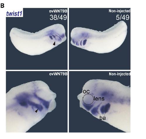Fig S6 wnt9b expression pattern in X. tropicalis at embryonic stage 28, related to Figure 6. wnt9b was highly expressed in ba and around the eyes. |