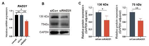 Fig S2 Knockdown of RAD21 in NCCs, related to Figure 2. (A) NCCs were subjected to siRAD21 transfection, the siRAD21 group exhibited a 29% reduction in RAD21. n = 3. (B) Western blot analysis of RAD21 expression in NCCs 5 days posttransfection. RAD21 protein levels was decrease of 32.5% for the 130 kDa full length RAD21 and 34.8% for the 75 kDa cleaved RAD21. (C) Quantification of RAD21 levels relative to siCon from (B). n = 3. *P < 0.05, **P < 0.01. |