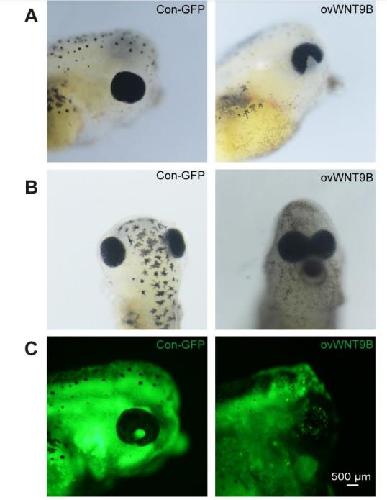 Figure 7. ovWNT9b affected eye development(A) At the two-cell stage of embryonic development, GFP was injected into one cell. At stage 41, there was no obvious abnormality in eye morphology developed from the injected cell. Scale bar = 500 μm.(B) At the two-cell stage of embryonic development, a combination of wnt9b and GFP was injected into one cell. At stage 41, 90% of eyes with wnt9b overexpression were malformed. Scale bar = 500 μm. |