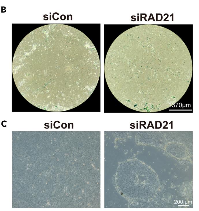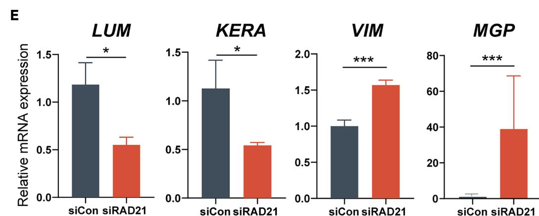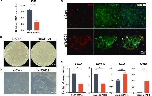 Figure 2. Impact of RAD21 deficiency on NCC activity(A) Ki67 exhibited 0.4-fold lower in the siRAD21 group compared to the siCon group. n = 3.(B) During the NCC differentiation process, SA-β-Gal staining revealed enhanced senescence features in NCCs with RAD21 deficiency. Scale bar = 1370 μm. n = 3.(C) During NCC differentiation into keratocytes, RAD21 knockdown cells exhibited clustering. Scale bar = 200 μm. n = 3.(D) Immunofluorescence staining at the end of differentiation revealed lower expression of KERA in the siRAD21 group compared to the siCon group, while VIM was more enriched in the siRAD21 group than in the siCon group. The siRAD21 group displayed reduced cell numbers and clustered growth. Scale bar = 200 μm.(E) qPCR displayed consistent expression trends for KERA and VIM as observed in (D). The scleral marker MGP exhibited 38.9-fold higher in the siRAD21 group compared to the siCon group according to RNA sequencing data. Data are presented as mean ± standard deviation. n = 3. ∗p < 0.05, ∗∗∗p < 0.001. |