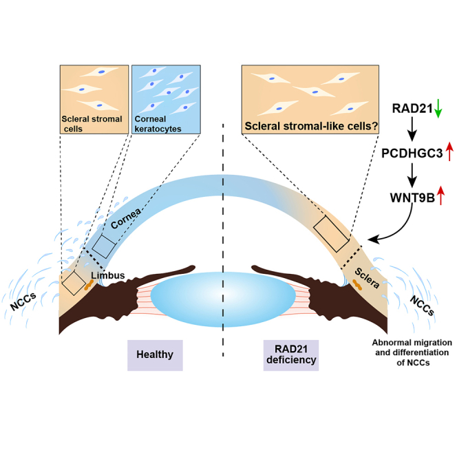 The cornea and sclera are distinct adjacent tissues, yet their stromal cells originate from common neural crest cells (NCCs). Sclerocornea is a disease characterized by an indistinguishable boundary between the cornea and sclera. Previously, we identified a RAD21 mutation in a sclerocornea pedigree. Here, we investigated the impacts of RAD21 on NCC activities during eye development. RAD21 deficiency caused upregulation of PCDHGC3. Both RAD21 knockdown and PCDHGC3 upregulation disrupted the migration of NCCs. Transcriptome analysis indicated that WNT9B had 190.9-fold higher expression in scleral stroma than in corneal stroma. WNT9B was also significantly upregulated by both RAD21 knockdown and PCDHGC3 overexpression, and knock down of WNT9B rescued the differentiation and migration of NCCs with RAD21 deficiency. Consistently, overexpressing wnt9b in Xenopus tropicalis led to ocular developmental abnormalities. In summary, WNT9B is a determinant factor during NCC differentiation into corneal keratocytes or scleral stromal cells and is affected by RAD21 expression.