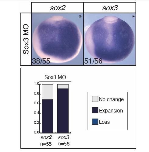 (loss, expansion, no change) in sox2 or sox3 expressing embryos. (B) In situ hybridization in stage 16 embryos unilaterally expressing sox2 or sox3 mRNA (*