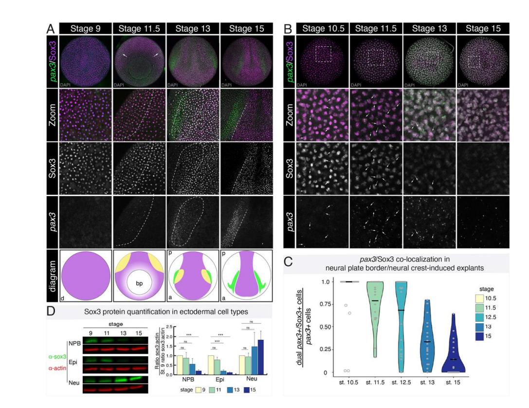 cells (stage 9), neural plate border-induced explants (stage 13), and neural crestinduced explants (stage 17) (Adapted from (York et al., 2023)). (D) Percentage of Sox3