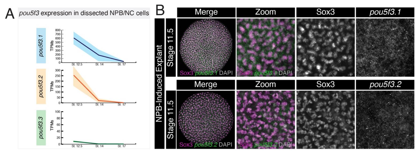 Fig. S11. pou5f3.1/2 are expressed in neural plate border cells (A) Average TPMs