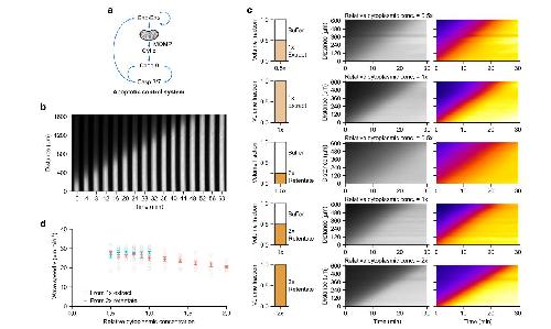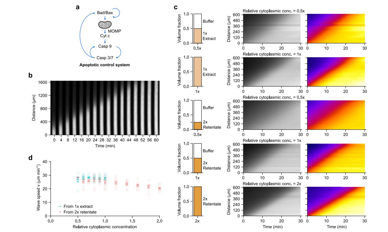 a Schematic view of the apoptotic control system. Note the multiple positive feedback loops. b A representative montage of an apoptotic trigger wave in a PTFE tube induced from the lower end. Bright signal is rhodamine 110 released by caspase 3/7 cleavage of (Z-DEVD)2-R110, which reports the activation of caspase 3/7. c Representative kymographs (middle and right columns) of extracts at different cytoplasmic concentrations prepared from either 1 x extract (top 2 rows) or retentate (bottom 3 rows). Rhodamine 110 fluorescence is shown in gray scale (middle column) or pseudo-color (right column). Pseudo-coloring demonstrates that a range of fluorescence thresholds would give very similar estimates of trigger wave velocity. d Speeds of apoptotic trigger waves at different cytoplasmic concentrations. Means ± S.E.M. are shown. Data are compiled from n = 9 independent experiments. Source data are provided as a Source Data file.