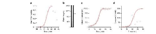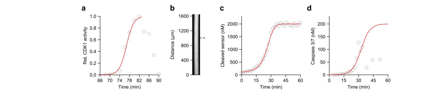 a Relative CDK1 activity as a function of time at mitotic onset, normalized to a maximal activity of 1, as measured by H1 kinase activity assay, can be well-fitted by a logistic model. Data are taken from Pomerening et al.41. b Apoptosis as a function of time, measured at one point in a Teflon tube of extract. Fluorescence was followed as a function of time by microscopy. c Kinetics of (Z-DEVD)2-R110 cleavage. Open circles are data at each time point. The red curve is based on the ODE model for caspase 3/7 activation and (Z-DEVD)2-R110 cleavage (Eq. 16) fitted to the data. d Kinetics of caspase 3/7 activation. Open circles are concentrations of active caspase 3/7 calculated based on the ODE model (Eq. 15). The red curve is the logistic equation fitted to the data. Source data are provided as a Source Data file.