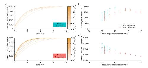 Fig. 4: The effective diffusion coefficient of AF488-BSA and apparent activation rate constant of caspase 3/7 decrease exponentially with cytoplasmic concentration.
