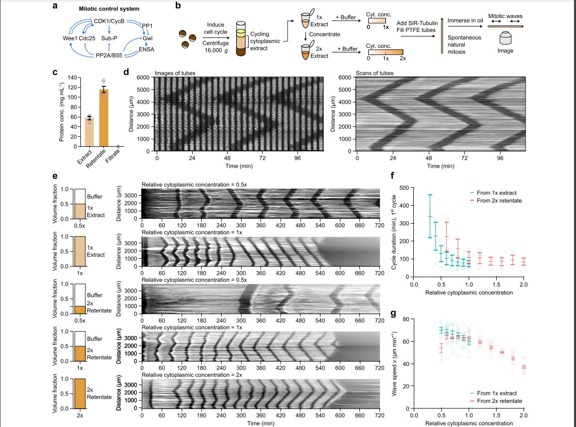 a Schematic view of the mitotic control network. Note the multiple interconnected positive and double-negative feedback loops. b Preparation of cycling Xenopus egg extracts and the workflow of monitoring spontaneous mitotic trigger waves in thin PTFE tubes by epifluorescence microscopy. c Measurements of protein concentrations in the original and concentrated extract (retentate) as well the filtrate from the ultrafiltration filters. n = 4 for extracts, 6 for retentates, and 5 for filtrates. d A montage (left) and its corresponding kymograph (right) of a single tube undergoing 3 rounds of mitosis in the course of ~2 h. The bright signal is polymerized microtubules stained with SiR-tubulin and the dark bands correspond to the mitotic state in which most microtubules are depolymerized. e Representative kymographs (right column) of extracts of different cytoplasmic concentrations prepared from 1 x extracts (top 2 rows) or from 2 x retentate (bottom 3 rows). Left column shows the volume fractions of buffer (XB buffer without sucrose) and extracts that went into the samples. f Duration of the first completely observable cell cycle under the microscope, starting from interphase. Means ± S.E.M. are shown, n = 3 (three independent experiments). g Speeds of mitotic trigger waves at different cytoplasmic concentrations. Means ± S.E.M. are shown. Data is compiled from n = 8 independent experiments. Source data are provided as a Source Data file.