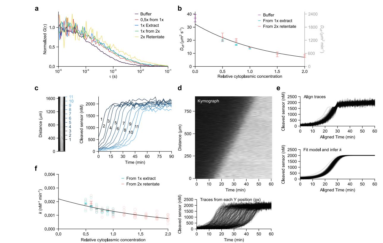 a Representative fluorescence correlation spectroscopy (FCS) autocorrelation functions for AF488-BSA in extracts with different cytoplasmic concentrations. (See paper for formula) is the autocorrelation function and (See paper for formula) is the time delay. b Effective diffusion coefficient of AF488-BSA at different cytoplasmic concentrations. Effective diffusion coefficients were calculated by fitting the autocorrelation data from FCS measurements to a Brownian diffusion model. A 60 s fluorescence intensity time course was registered for each FCS measurement. Means ± 90% CI calculated from 3 measurements (n = 1) are shown. Solid black curve is an exponential curve fitted to the means. c (Z-DEVD)2-R110 cleavage kinetics can be monitored as apoptotic trigger waves sweep through a tube of extract. In this example, fluorescence from cleaved (Z-DEVD)2-R110 at 11 positions (left) are shown on the right. Cleaved (Z-DEVD)2-R110 concentration was inferred from fluorescence. d (Z-DEVD)2-R110 cleavage kinetics in a kymograph (upper) can be represented as a series of traces (lower). e Traces shown in (d) were aligned by time (upper) and the model for caspase 3/7 activation and (Z-DEVD)2-R110 cleavage was fitted to the data. Individual fitted traces are shown in the bottom panel. f The effective positive feedback rate constant