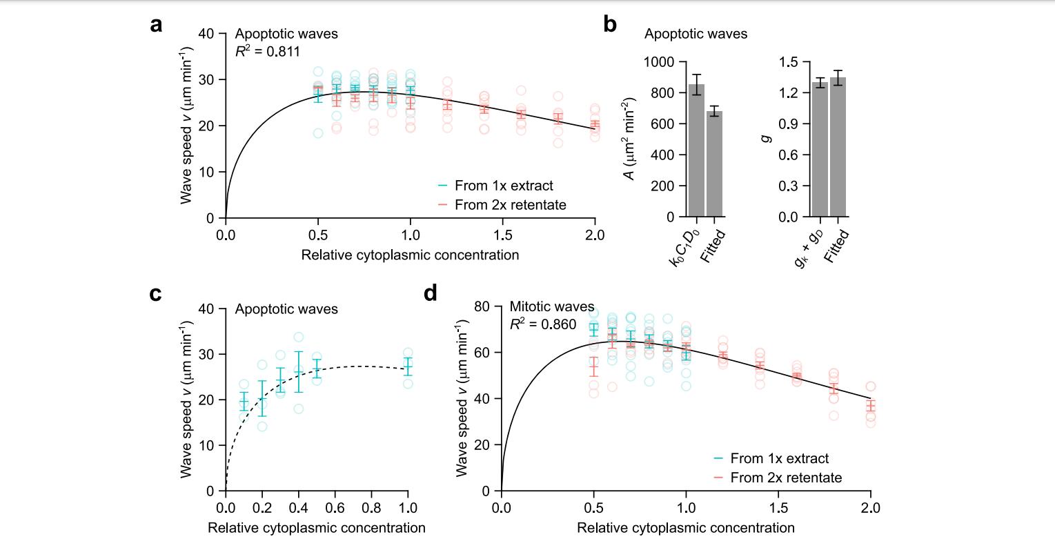 (See paper for formula), (See paper for formula), and (See paper for formula), is compared to the fitted value (left panel). Likewise, the value of (See paper for formula) calculated as the sum of the experimentally determined parameters (See paper for formula), and (See paper for formula), is compared to the fitted value (right panel). (See paper for formula), (See paper for formula), (See paper for formula), and (See paper for formula) are from the exponential fits shown in Fig. 4. Error bars are S.E.M.s calculated directly from the fittings or propagated from the individual experimentally determined parameters. c Apoptotic wave speeds at low cytoplasmic concentrations. Dashed line shows the same fitted curve as in (a), which was obtained from only higher concentration data. Shown are means ± S.E.M. from 3 independent samples. d Mitotic wave speeds at different cytoplasmic concentrations, replotted from Fig. 1g and fitted to the generalized Luther’s formula (black curve). Error bars are means ± S.E.M. Data are from 8 independent experiments. Source data are provided as a Source Data file.