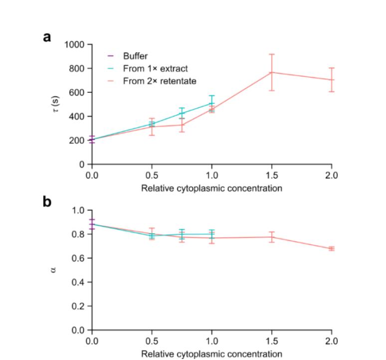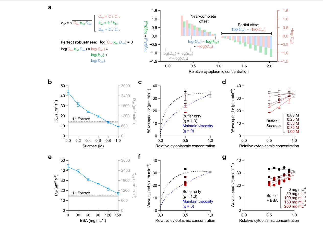 a Comparing the effect sizes of changes in rate constant, effective diffusion coefficient, and concentration. Effect size is defined as fold change relative to 1 x cytoplasmic concentration. For simplicity, the data for cytoplasmic concentrations < 0.3x, where the concentration effect dominates, are omitted. b, e Effective diffusion coefficients of AF488-BSA in XB buffers of various sucrose concentrations (b; no BSA present) or BSA concentrations (e; no sucrose present) as determined by FCS. Means ± 90% CI (n = 1) calculated from 3 measurements are shown. AF488-BSA diffusion in 1 x extract can be mimicked by ~0.8 M sucrose or ~150 mg mL−1 BSA. c, f Apoptotic trigger wave speeds with extracts diluted with buffer (black data points) or a viscogen (red data points) and compared with theoretical curves (dashed lines). Crowding effects are quantified by the parameter (See paper for formula). For apoptotic trigger waves,