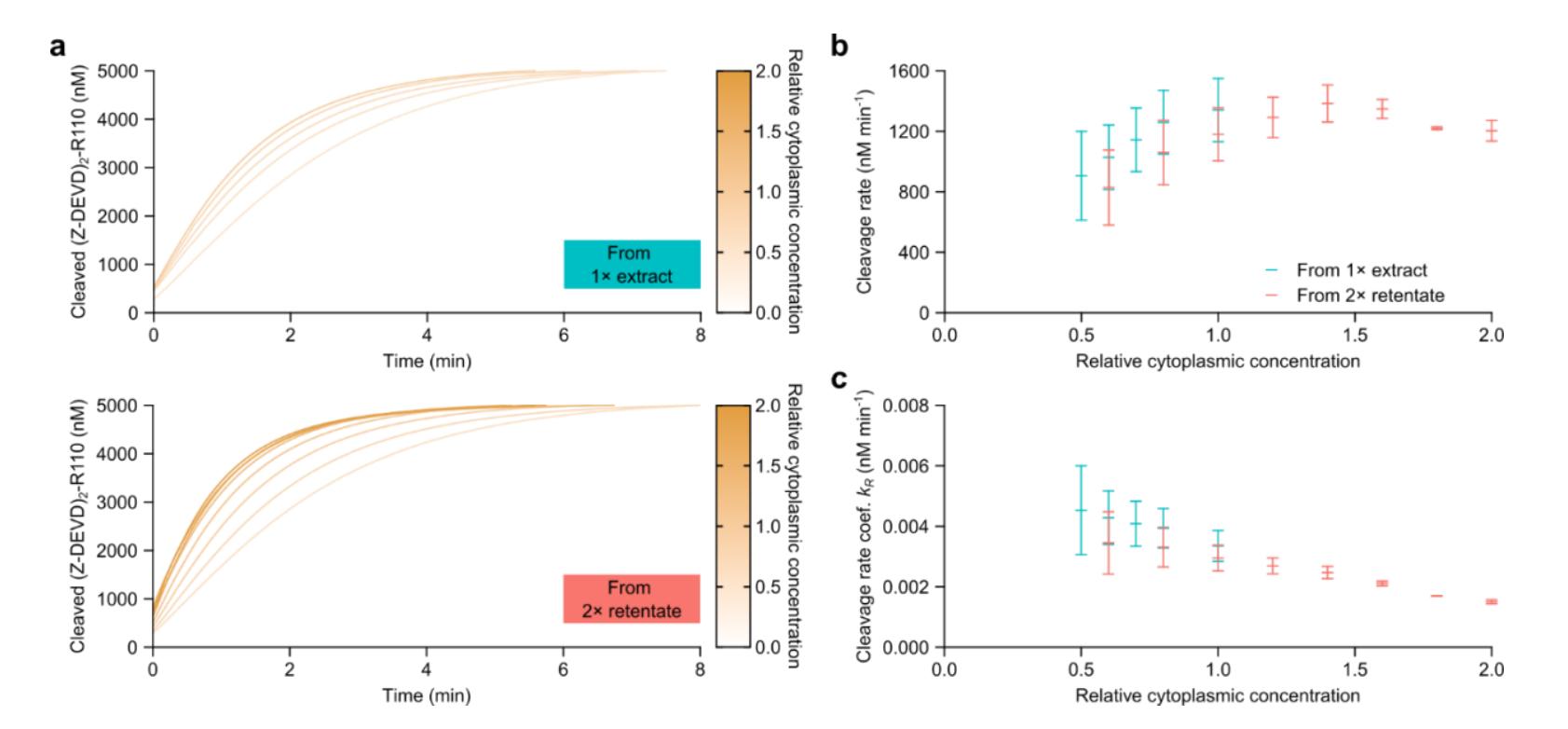 coefficients at different cytoplasmic concentrations were computed by accounting for (ZDEVD)2-R110 concentration and nominal active caspase 3/7 concentrations. Data are presented