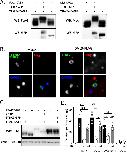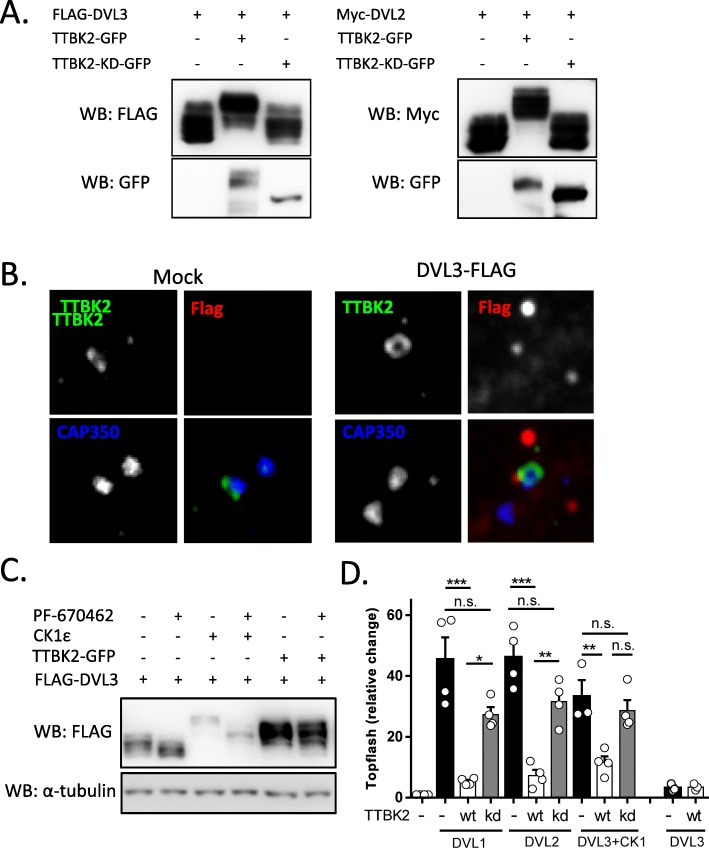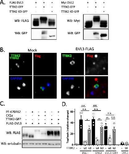 Fig. 1. Identification of TTBK2 as a novel DVL kinase. a: HEK293 cells were transfected with FLAG-DVL3 and Myc-DVL2 plasmids with wild type (wt) or kinase dead (KD) TTBK2-GFP. Active TTBK2 promoted phosphorylation-dependent mobility shift of DVL3 on Western blotting. b: Endogenous TTBK2 (green) localized into distal appendages of the mother centriole in hTERT-RPE1 cells (left). Overexpression of FLAG-DVL3 (stained in red) was not able to displace TTBK2 from the centriole (right). Centrioles were stained with CAP350 (blue). c: HEK293 cells were transfected with indicated plasmids, treated with CK1ε inhibitor PF-670462 (10 μM) and subsequently analyzed by Western blotting. TTBK2-induced electrophoretic mobility shift of DVL3 was not diminished upon CK1ε inhibition unlike the mobility shift induced by CK1ε. d: HEK293 cells were transfected with indicated plasmids and by the TopFLASH reporter system. Luminescence in the cell lysates was measured 24 h after transfection. Mean, SD and individual data points are indicated. Statistical differences were tested by One-way ANOVA and Tukey’s post test (* p < 0.05, ** p < 0.01, *** p < 0.001)