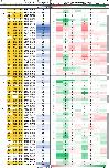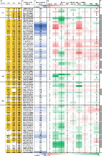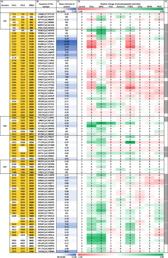 Fig. 5. Phosphorylation map of DVL3. All identified phosphorylation sites obtained from the pipeline #2 are visualized as a heatmap. Color intensities reflect relative change in the site phosphorylation (red – decrease, green – increase). Following additional information is also provided: a) Corresponding sites in human DVL1 and DVL2. Positions conserved in DVL1 and/or DVL2 either as Ser or Thr are highlighted in yellow. Position of the structured domains (DIX, PDZ and DEP) is indicated. b) The sequence of the phosphorylated epitope. Five amino acids before and after the identified phosphorylated site are shown. c) Mean absolute intensities of the phosphorylation sites in the control (DVL3 without exogenous kinase; N = 6) are expressed in the shades of blue. Numbers indicate decadic logarithm of the mean. ND indicated in white corresponds means “not detected”. All signals lower than 1 × 106, corresponding to log value 6.0 were considered as not detected. d) Nine columns represent heat map of relative change of phosphorylated peptide intensities (in log10 scale) obtained for individual kinases (relative to control). Numbers in the heatmap fields (0, 1, 2, 3) indicate the number of experimental replicates with the positive identification of the given phosphorylated site. e) Grey boxes indicate the position of clusters of sites analyzed also according to the pipeline #3 in the Additional file 2: Figure S2