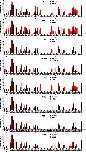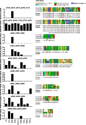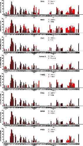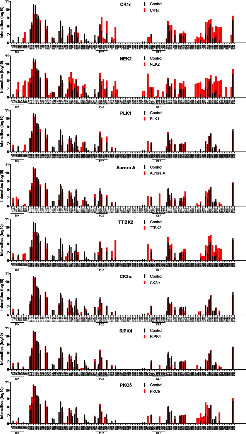 Fig. 8. Phosphoplots - phosphorylation barcodes of DVL3 with the individual kinases. Visualization of absolute intensity of phosphorylated peptides corresponding to the individual phosphorylated sites plotted on the primary sequence of DVL3 (only Ser and Thr are shown). Black bars represent a control condition, red bars the intensities in the presence of the kinase. Intensities are plotted on a log10 scale