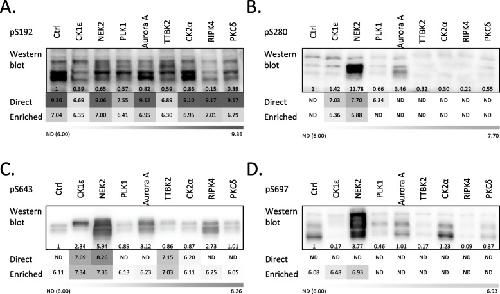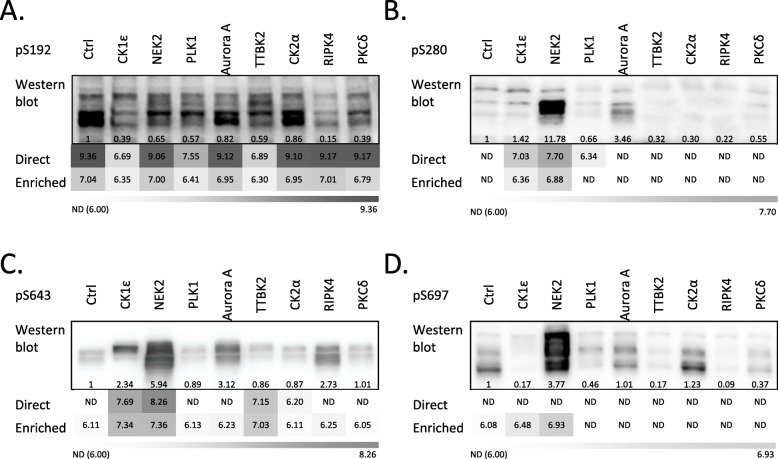 Fig. 7. Comparison of individual methods and their validation by phospho-specific antibodies. a-d. Comparison of methods. Existing phosphorylation-specific antibodies were used to visualize the level of phosphorylation of DVL3 with our kinase panel. HEK293 cells were transfected by the indicated combination of plasmids and analyzed by Western Blotting. Reactivity of individual phosphoantibodies against DVL3 phosphorylated by individual kinases is shown. Western blots are quantified using ImageJ software as absolute values for peak areas of corresponding bands and the intensities were normalized to the control. Mean intensities of the phosphorylated peptides obtained by MS/MS via pipelines #1 and #2 are shown in the shades of grey. Numbers indicate decadic logarithm of the mean peptide intensity. “Not detected” (ND) indicated in white corresponds to the signals below 1 × 106, i.e. 6.0. a. anti-pS192 (this study), b. anti-pS280, c. anti-pS643, d. anti-pS697