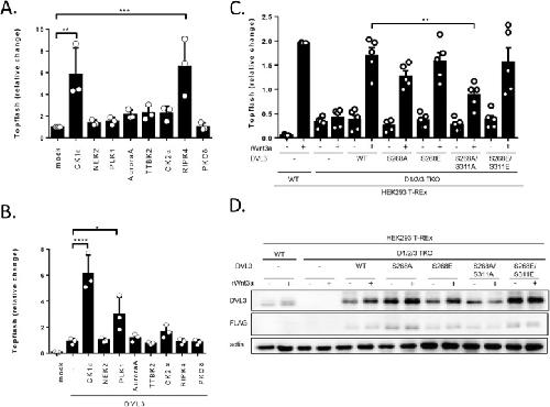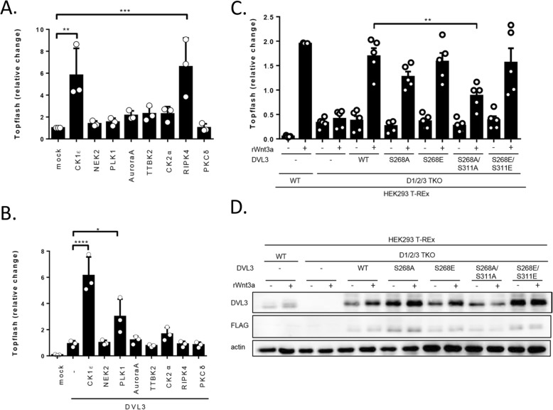 Fig. 9. Phosphorylation of S268 and S311 contributes to the activation of the Wnt/b-catenin pathway. a, b: HEK293 cells were transfected by indicated plasmids together with TopFlash and Renilla reporter plasmids. The ability of individual kinases to induce activation of Wnt/β-catenin pathway either alone (a) or in combination with DVL3 (b) was analyzed. Mean, SD and individual data points are indicated. Statistical differences were tested by One-way ANOVA and Tukey’s post test (* p < 0.05, ** p < 0.01, *** p < 0.001, **** p < 0.0001). c, d: Rescue experiments with DVL3 S268/S311 mutants. WT and D1/2/3 TKO HEK293 T-Rex cells were transfected as indicated and treated according to the scheme with 80 ng/ml recombinant human Wnt3a (rWnt3a). All samples were treated with 0.1 μM LGK974 inhibitor and 250 ng/ml R-SPONDIN1 and analyzed by TopFlash assay (c). Mean, SD and individual data points are indicated. Statistical differences were tested by paired t-test (* p < 0.05, ** p < 0.01). Samples were also used for WB analysis (d)