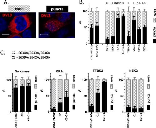 Fig. 10. Phosphorylation of S630-S643 promotes even localization of DVL3. a: HEK293 cells were transfected in the indicated combinations and the subcellular localization of DVL3 was assessed by immunocytochemistry. DVL3 was localized in two typical patterns – either in cytoplasmic puncta or evenly dispersed in the cytoplasm (upper panel). Scale bar, 7.5 μm. b: The effects of individual kinases on DVL3 localization is shown in the bottom panel (HA-DVL3 was used for PLK1 and TTBK2, FLAG-DVL3 for the rest of kinases). c: Phosphorylation patterns associated with the even localization of DVL3 were analyzed by mutation of cluster of serine residues to alanine. Statistical data represent mean + SD from three independent experiments (N = 3× 200 cells). Statistical significance was confirmed by the comparison of the corresponding control (DVL3-FLAG or DVL3-HA without kinase) and DVL3 with individual kinases by One-way ANOVA and Tukey’s post test (* p < 0.05, ** p < 0.01, n.s. - not significant)