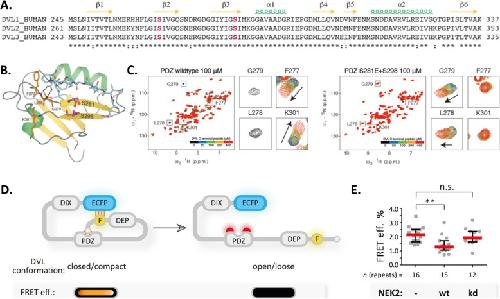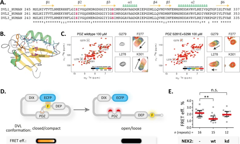 Fig. 11. NEK2 phosphorylation in PDZ domain promotes open conformation of DVL3. a: PDZ sequence alignment of the three human DVL isoforms. The conserved serine residues phosphorylated specifically by NEK2 are highlighted in magenta. b: Crystal structure of DVL2 PDZ domain bound to internal ligand (PDB: 3CC0). The two serines prone to NEK2 phosphorylation are shown in magenta, the bound peptide in cyan, and PDZ residues of the binding loop or close to the binding loop in orange. c: NMR titrations of DVL3 C-terminal peptide to DVL2 wildtype PDZ or S281E/S298E phosphomimicking mutant. Magnified insets show the qualitative differences in peptide binding for PDZ residues annotated in (b). d: Schematic depiction of the FRET efficiency experiment of the ECFP DVL3 FlAsH III construct. In the default conformation, the DVL molecule is less phosphorylated and closed/compact, which is reflected in the close proximity of the FRET pair (ECFP and FlAsH (F) tags) – leading to the high intramolecular FRET efficiency (depicted as orange dash lines). In the presence of the active kinase (e.g. NEK2), DVL is phosphorylated in the PDZ domain, which promotes the open/loose conformation by the disruption of the C-terminus/PDZ domain interaction. This is reflected in the high proximity of ECFP and F tags thus leading to the low intramolecular FRET efficiency (no orange dash lines). e: HEK293 cells were transfected in the indicated combinations and the intramolecular FRET efficiency of the ECFP-DVL3 FlAsH III construct (schematically depicted in D) was measured. The data represent median ± interquartile range from three independent experiments (numbers of analyzed cells are indicated below). Statistical significance was confirmed by One-way ANOVA and Tukey’s post test (** p < 0.01, n.s. - not significant). FRET eff. Stands for Förster-Resonance-Energy-Transfer efficiency, ECFP for Enhanced Cyan Fluorescent Protein, F for FlAsH tag, and kd for kinase dead