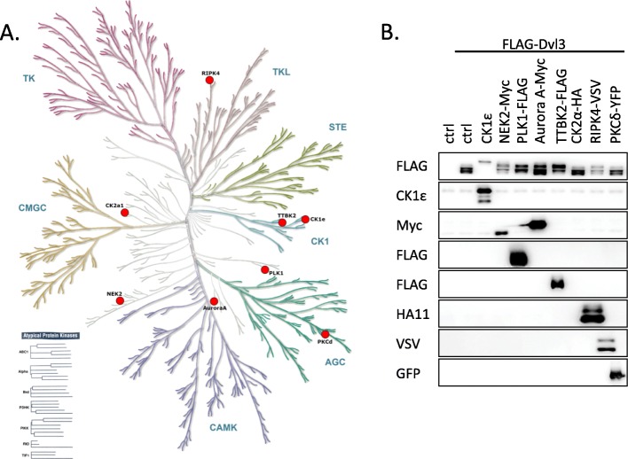 Fig. 2. Validation of the panel of DVL3 kinases. a: Visualization of the kinases used in this study in the phylogenetic kinome tree (http://www.kinhub.org/kinmap/). The individual kinases are representatives of distant kinase groups except for CK1ε and TTBK2 that are members of CK1 superfamily. b. HEK293 cells were transfected by plasmids encoding FLAG-DVL3 and the indicated kinase. Ability of individual kinases to promote DVL3 phosphorylation detected as the electrophoretic mobility shift on WB was assayed. Alpha-tubulin was used as a loading control