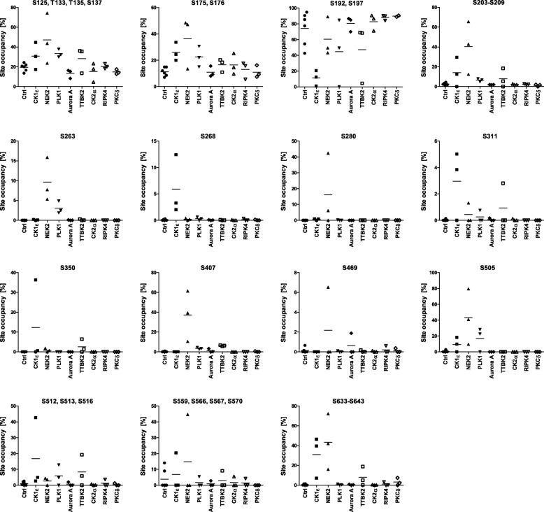 Fig. 4. Site occupancy of the abundant phosphorylated sites. Site occupancy analysis was performed according to the pipeline #1 in Fig. 3a. Fifteen phosphorylated peptides or clusters that were phosphorylated in more than 5% at least in one replicate are plotted. Graphs present individual data points from three biological replicates (two controls/biological sample) and the mean values (horizontal line)