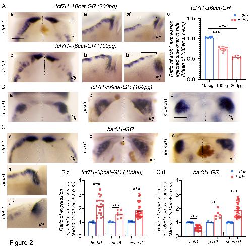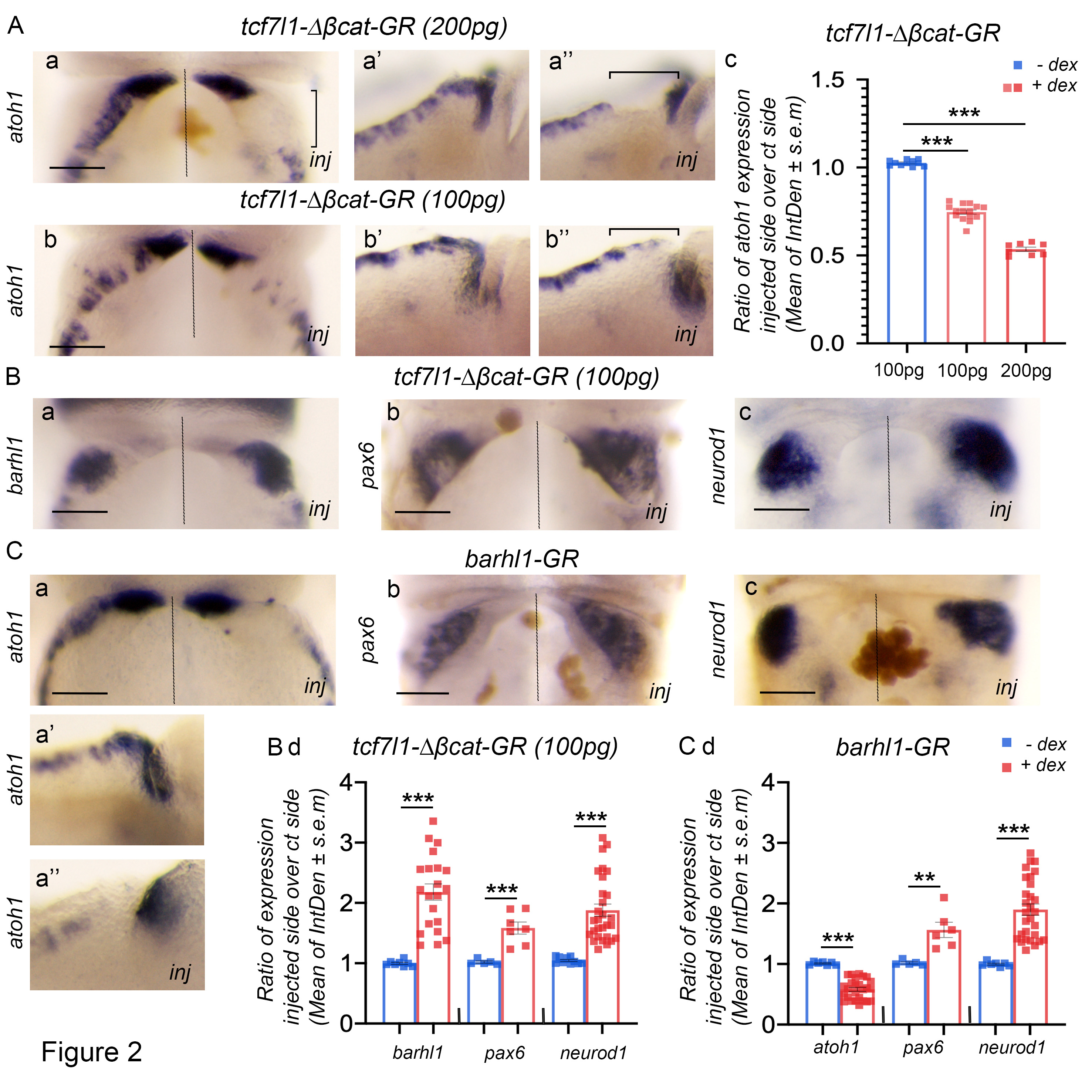 Fig. 2. TCF activity is required for the induction of the upper rhombic lip and its inhibition by Barhl1 is necessary for the proper progression of granule neuron progenitor development. (A) Overexpression of tcf7l1-delta Beta-cat-GR inhibits and/or abolishes atoh1 expression in a dose-dependent manner. In situ hybridization analysis of atoh1 expression in rhombomere 1 (R1) showing dorsal views (a,b) and lateral views (a',a'',b',b'') of control sides (a',b') and injected sides (a'',b'') of stage 45 X. laevis embryos unilaterally injected with 200 pg (a-a'') or 100 pg (b-b'') of tcf7l1-delta Beta-cat-GR. The non-injected side is an internal control. (B) Forced expression of tcf7l1-delta Beta-cat-GR at low doses stimulates granule neuron progenitor (GNP) differentiation. In situ hybridization analysis of the commitment and/or differentiation markers barhl1, pax6 and neurod1 (a-c) in stage 45 X. laevis embryos unilaterally injected with 100 pg of tcf7l1-delta Beta-cat-GR. (C) barhl1 overexpression phenocopies the defects of tcf7l1dn overexpression. Dorsal views showing atoh1, barhl1 and neurod1 (a-c) expression in R1 primordium of stage 45 X. laevis embryos injected with mBarhl1GR (200 pg). Lateral views of atoh1 expression in control side (a') and injected side (a'') are shown. (Ac,Bd,Cd) Integrated densities (IntDen) of marker expressions were measured. Ratio of marker expression in injected side over control side is shown. Data are mean +/-s.e.m. The result from each tadpole is represented by a square. Dotted lines separate injected and control sides. Scale bars: 150 um. Square brackets delineate R1 in A. Dex, dexamethasone; inj, injected side. Statistical analysis: (Ac) one-way ANOVA (F(2,31)=437.5; P<0.001) followed by a post-hoc Tukeys test; (Bd,Cd) unpaired Students t-test. **P0.01; ***P0.001. |