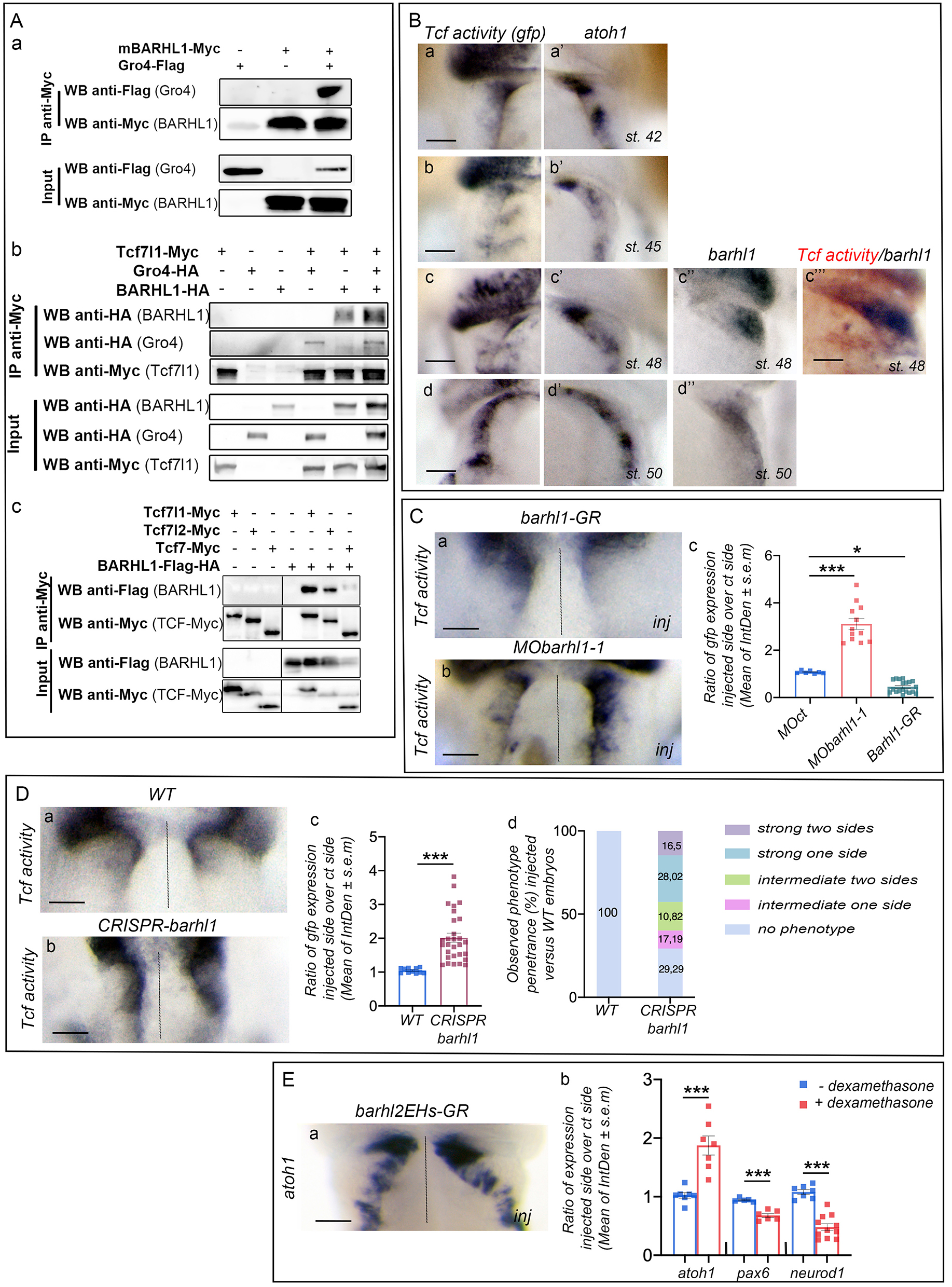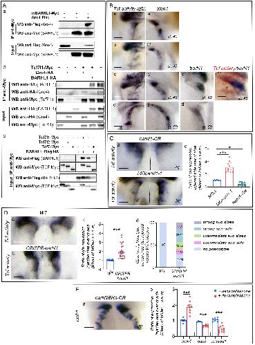 Fig. 4. Barhl1 physically interacts with Tcf7l1 and Gro, and limits TCF transcriptional activity. (A) HEK293T cells were transfected with plasmids encoding indicated tagged proteins. Cell lysates were immunoprecipitated (IP) using anti-cMyc antibody. Input and IP samples were subjected to western blot analysis using indicated antibodies. Equal amounts of protein lysates were loaded onto SDS gels. (Aa) Barhl1 interacts with Groucho 4 (Gro4) and Tcf7l1. (Ab) The interaction between Barhl1 and Tcf7l1 is detected in the presence and in the absence of Gro. (Ac) Barhl1 interacts with Tcf7l1, Tcf7l2 and Tcf7. (B) TCF activity is detected in the upper rhombic lip (URL) in an area overlapping that of atoh1, and complementary to that of barhl1. In situ hybridization in the X. tropicalis pbin7LefdGFP line at indicated stages (st.) showing gfp (TCF activity) (Ba,b,c,d), atoh1 (Ba',b',c',d') and barhl1 (Bc'',d'') expression patterns. (Bc) Double in situ hybridization showing expression of barhl1 (blue) and gfp (red). Dorsal views of one side of the embryos are shown. (C,D) Barhl1 limits TCF transcriptional activity in vivo. In situ hybridization analysis of gfp expression in X. tropicalis pbin7LefdGFP embryos injected either unilaterally with (Ca) mBarhl1GR (200 pg) and (Cb) MObarhl1-1, or before division with (Db) Crispr-barhl1. Embryos injected with Crispr-barhl1 were compared with their wild-type (WT) siblings. (Dd) Percentage of phenotype penetrance in CRISPR barhl1-injected tadpoles. (E) Interaction between Barhl1 and Gro is required for Barhl1 function. mBarhl2EHsGR contains only the two EH1 motifs of Barhl2 and acts as a dominant negative by capturing Gro. (Ea) In situ hybridization showing atoh1 expression in injected versus control side. (Cc,Dc,Eb) Quantification. Integrated densities (IntDen) of marker expression are measured. The ratio of marker expression in injected side over control side is represented and indicated as mean +/-s.e.m. The result from each tadpole is represented by a square. Percentage of phenotype penetrance is quantified in embryos injected with Crispr and/or barhl1 versus wild-type embryos based on indicated criteria. Dotted lines separate injected and control sides. Scale bar: 150 um. inj, injected side. Statistical analysis: (Cc) one-way ANOVA [F(2,35)=111,3; P<0.001] followed by post-hoc Tukeys test; (Dc,Eb) unpaired, two-tailed Students t-test. Data are presented as means.e.m. *P0.05; ***P0.001. |