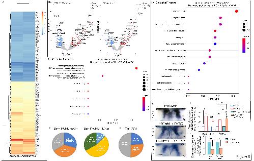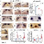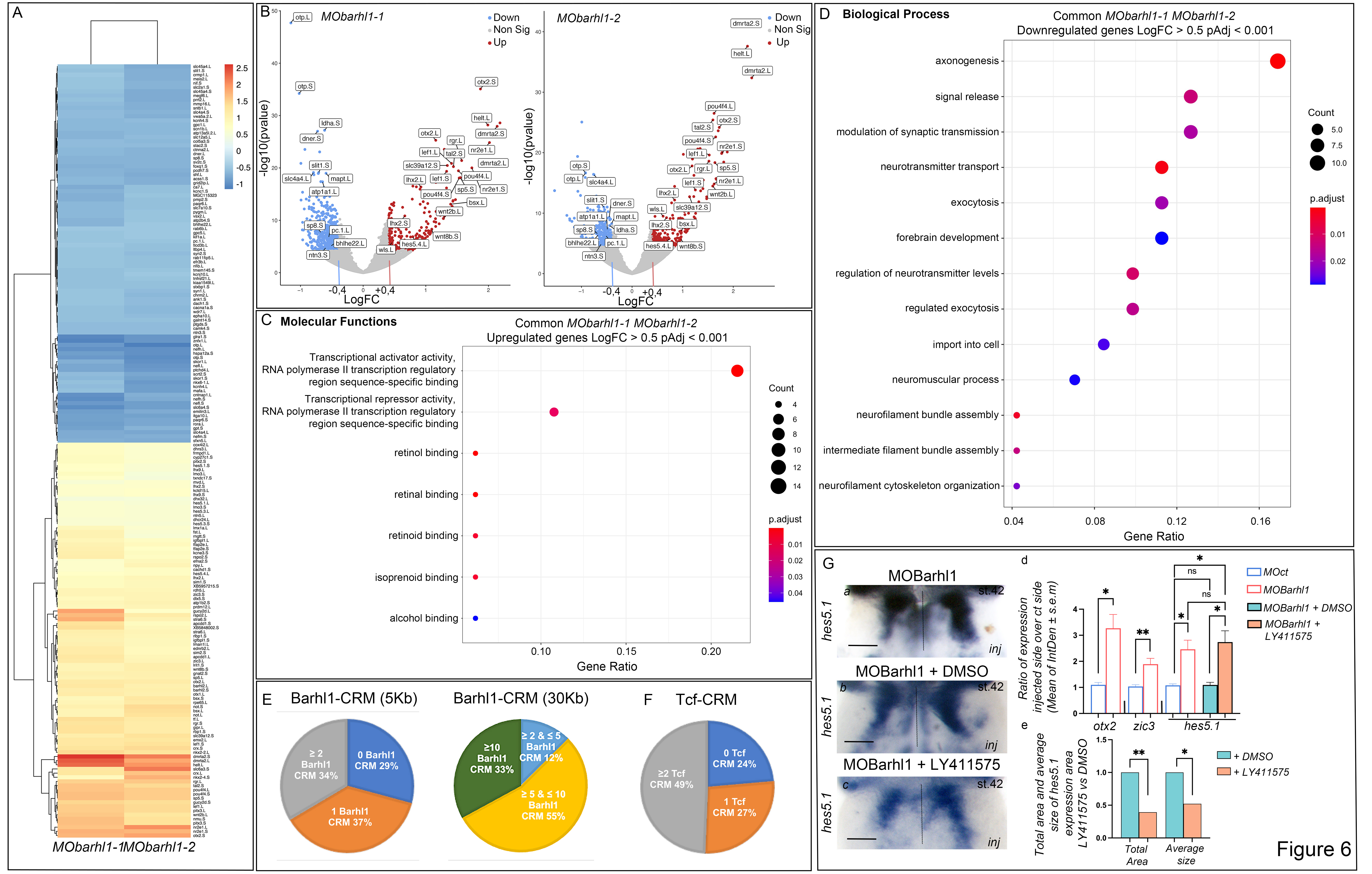 Fig. 6. RNA-sequencing data processing and analysis. (A) Differentially expressed gene (DEG) visualization heatmap displaying expression profiles of most significantly upregulated and downregulated DEGs for each condition (MObarhl1-1 versus MOct; MObarhl1-2 versus MOct). Each row represents a gene; each column represents a sample. Results are shown as a gradient from blue (downregulated) to dark orange (upregulated). The heatmap was generated using R package. (B) Volcano plots showing a selection of significant DEGs with pAdj<0.001 in (left) MObarhl1-1 versus MOct and (right) MObarhl1-2 versus MOct. Upregulated genes with Log2FC>0.4 and downregulated genes with Log2FC<0.4 are shown. Red and blue dots indicate significant DEGs that are upregulated and downregulated, respectively. Grey dots indicate RNAs with non-significant differences. PCA and volcano plots were generated using Galaxy. (C,D) Gene ontology enrichment comparison. The altered molecular functions (C, y-axis) and biological processes (D, y-axis) for selected upregulated (C; Log2FC0.5, PAdj<0.001) and downregulated (D; Log2FC-0.5, PAdj<0.001) DEGs. Enrichment analysis comparing functional profiles among MObarhl1-1 and MObarhl1-2 was performed on the DEGs common to both conditions. Results are visualized as a dot plot based on indicated gene counts and adjusted P-values for enrichment. Dot size corresponds to the count of differentially expressed genes associated with the molecular function or the biological pathway; dot color refers to the adjusted P-value for enrichment. (E,F) Barhl1 (E) and TCF cis regulatory motifs (CRM) (F) in regulatory regions of MOBarhl1 DEGs: pie chart of the percentage of MObarhl1 DEGs located 5 kb or 30 kb upstream or downstream of their TSS, as indicated. (G) In situ hybridization analysis of three DEGs: dorsal views of the R1 territory of stage 42 X. laevis embryos unilaterally injected with MObarhl1-1 using hes5.1 as an in situ hybridization probe. (Ga) hes5.1, (Gb) hes5.1 with DMSO, (Gc) hes5.1 with LY411575, (Gd) quantification, and (Ge) total and average size of the hes5.1 expression area in embryos grown in LY411757 relative to embryos grown in DMSO. The result from each tadpole is represented by a square. inj, injected side. Statistical analysis was carried out using a unpaired, two-tailed Students t-test. *P0.05; **P0.01. |