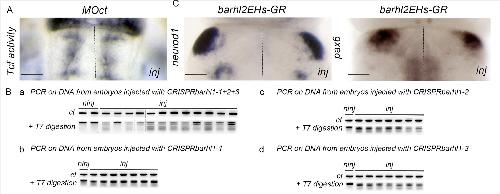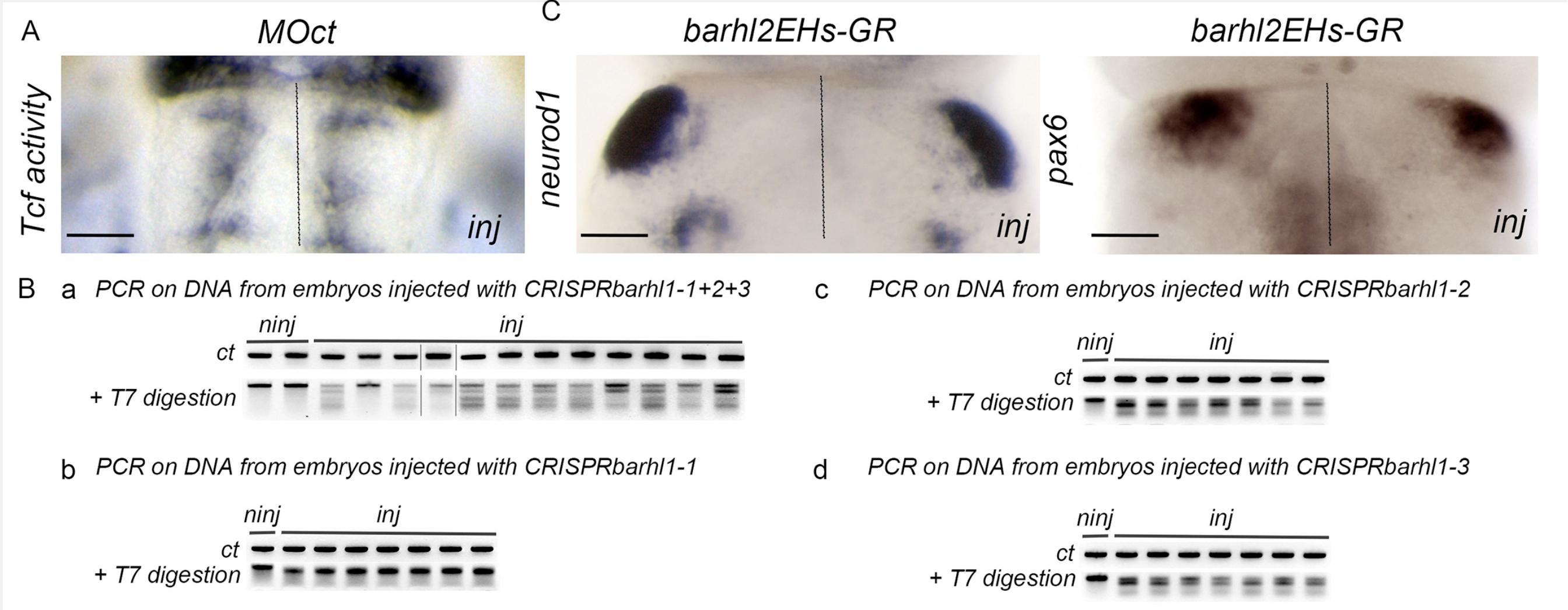 Figure S4 (A) in situ hybridization analysis of gfp expression (Tcf activity) performed on X. tropicalis pbin7LefdGFP line injected with morpholino control (MOct). (B) in situ hybridization analysis showing decreased expression of neurod1 and pax6 in embryos unilaterally injected with barhl2EHs-GR. inj: injected side. Scale bar 150m. (B) Efficiency of CRISPR/Cas9- mediated mutation of Barhl1 in X. tropicalis using T7E1 assay. Representative gel images displaying Polymerase Chain Reaction (PCR) products amplified from genomic DNA isolated from non-injected embryos (ninj) and from embryos injected (inj) with CRISPRbarhl1-1; CRISPRbarhl1-2; CRISPRbarhl1-3 mixed (a) or each alone (b-c-d) and treated (+T7 digestion) or not (ct: control) with T7E1. PCR product size is 430bp in ct samples. |