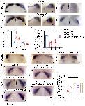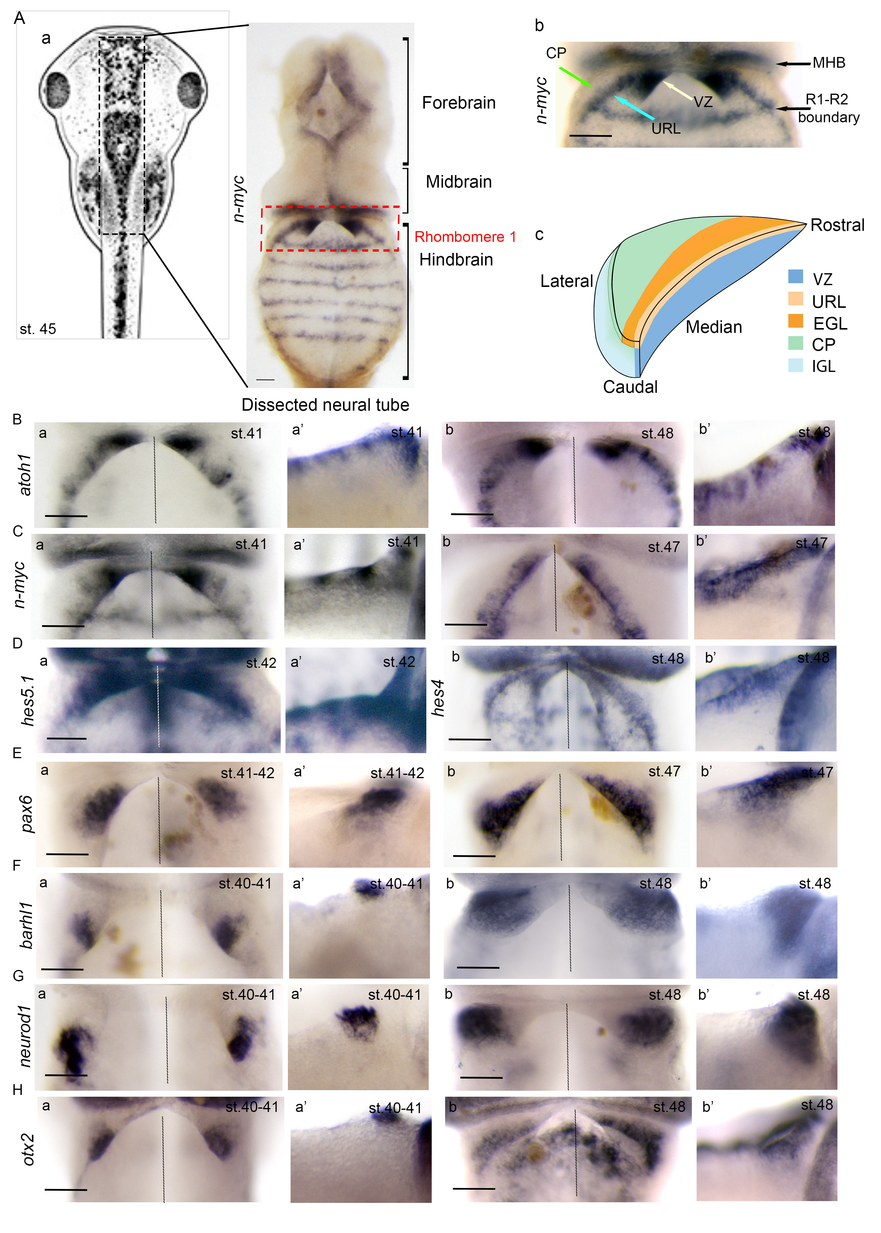 Fig. 1. Temporal and spatial expression pattern of genes involved in granule neuron progenitor development. (A) Neural tube dissection and analysis. (Aa) Representation of stage (st.) 45 X. laevis embryo. After in situ hybridization, neural tubes are dissected, as indicated on the right (entire neural tube) and in Ab, which focuses on rhombomere 1. The proliferation marker nmyc is expressed in the upper rhombic lip (URL) (blue arrow) and the ventricular zone VZ (white arrow). Red dotted line delineates rhombomere 1 (R1), which is located caudal to the midbrain-hindbrain boundary (MHB). nmyc marks proliferating progenitors at the boundary between R1 and R2, and is used as a marker of the caudal limit of the cerebellar primordium. The cerebellar plate (CP) is indicated (green arrow). (Ac) A stage 42 Xenopus half R1. (B-H) In situ hybridization analysis of granule neuron progenitor (GNP) markers in X. laevis embryos at the indicated Nieuwkoop and Faber stages. Dorsal (a,b), lateral (a',b'). Key: CP, cerebellar plate; VZ, ventricular zone; URL, upper rhombic lip; EGL, external granule layer; R, rhombomere; MHB, midbrain-hindbrain boundary. Scale bars: 150 um. |
