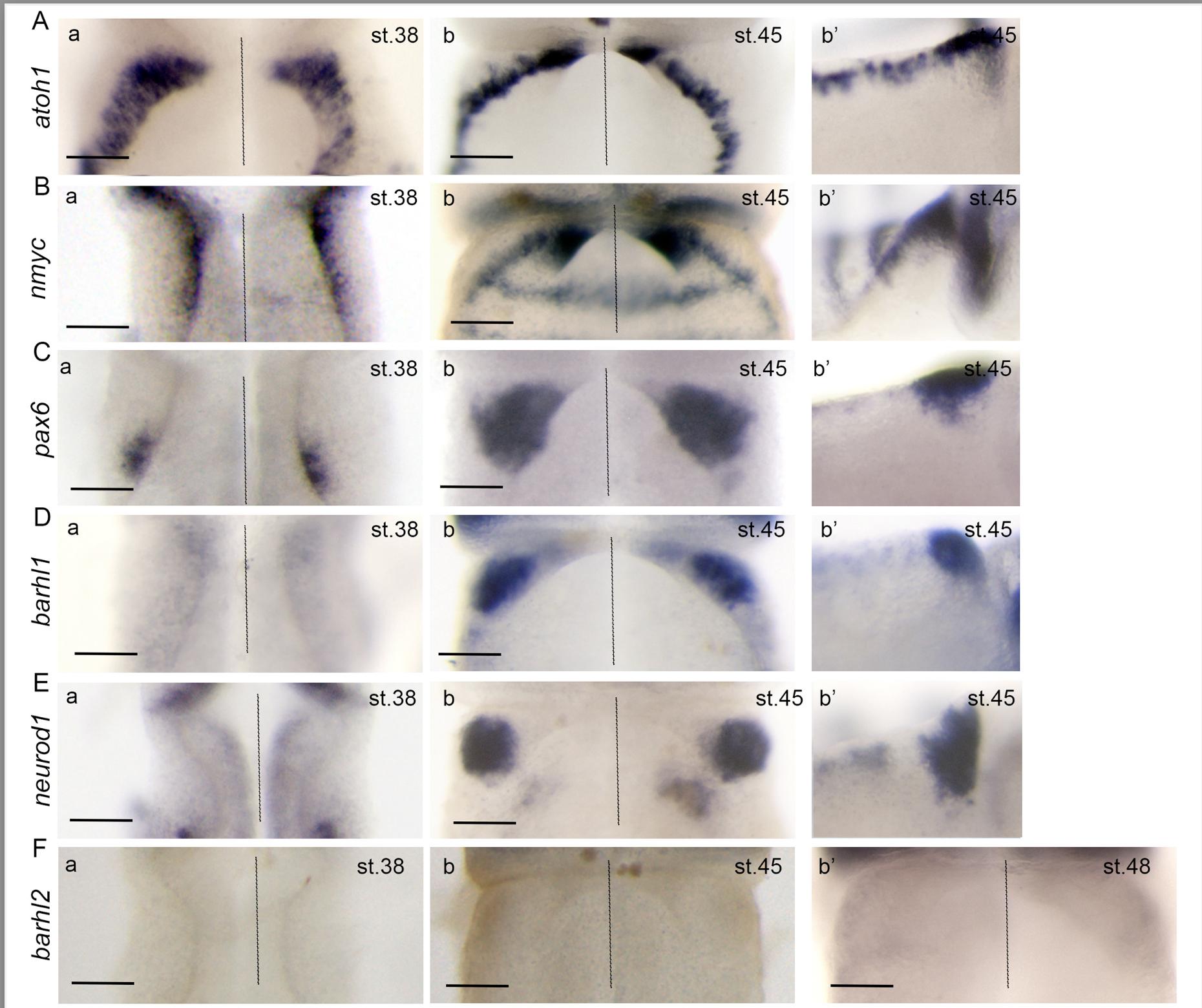 Figure S1. Granule neuron progenitors' development in X. laevis Spatial and temporal expression of key markers of GNPs development in the cerebellar anlage of X. laevis at indicated stages (st.). Shown are (A-Ea) dorsal view of st. 38 and (A-E) dorsal (b) and lateral (b) views of st. 45 X. laevis neural tubes stained with indicated markers. (A) atoh1 expression is detected in the URL (B) the proliferation marker nmyc is expressed in the URL, the VZ, and in proliferating progenitors at the boundaries between the rhombomeres (R). (C) pax6+ GNPs are first detected around st. 38 in amphibian. (C, D) pax6 and barhl1 mark the committed GNPs while (E) neurod1 is expressed in differentiated GNs. (F) Dorsal views of st. 38, 45 and 48 showing absence of barhl2 expression in the R1 of amphibian. Scale bar 150m. |